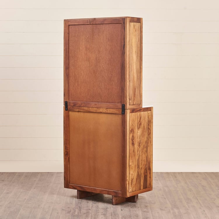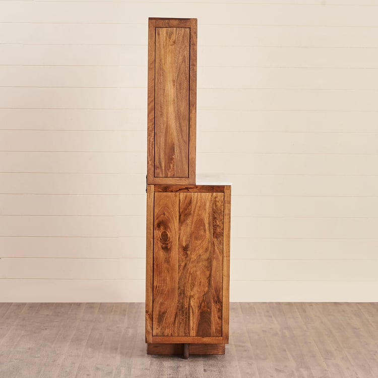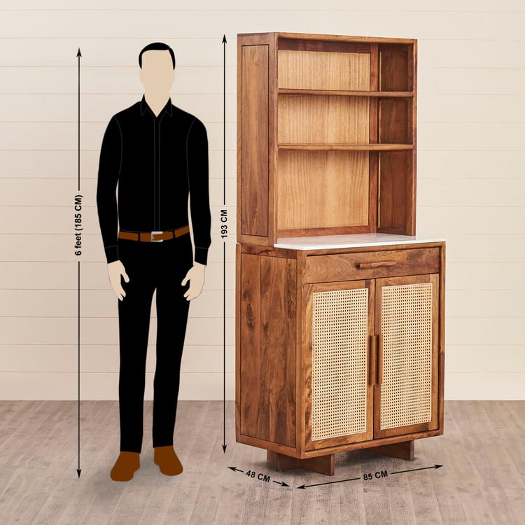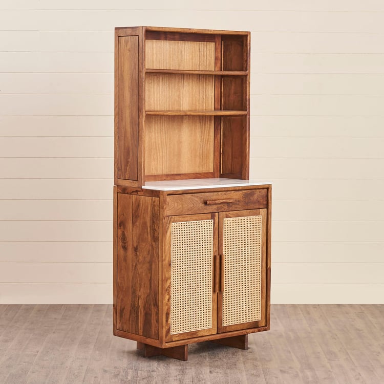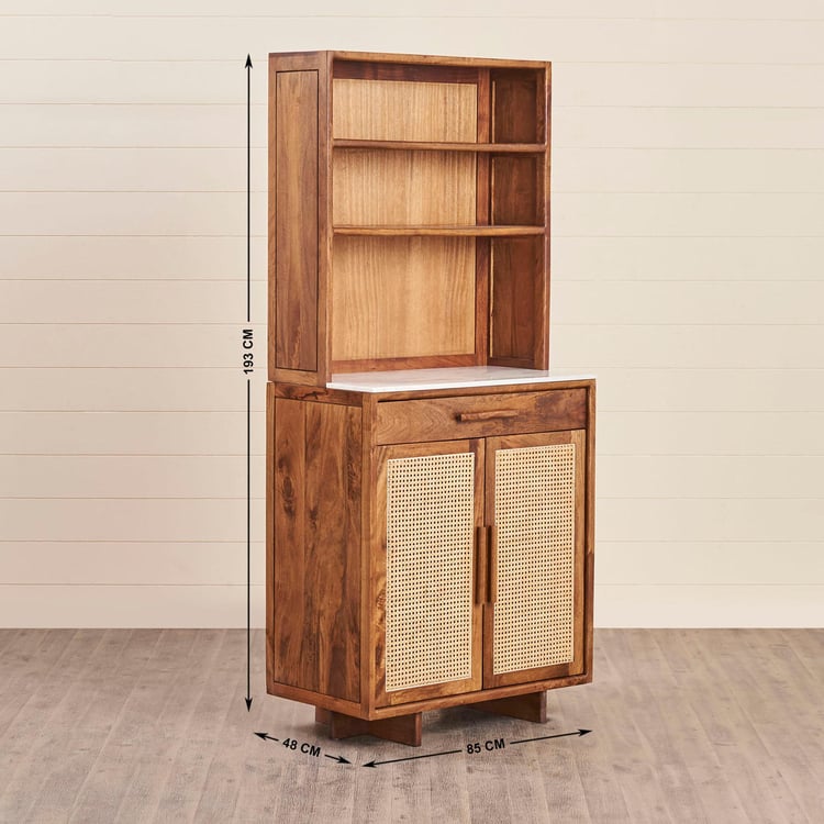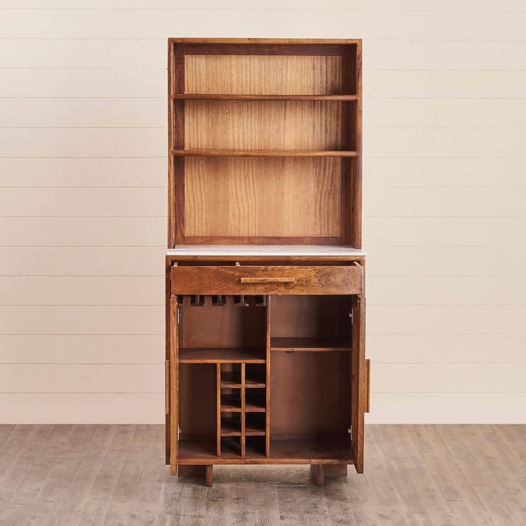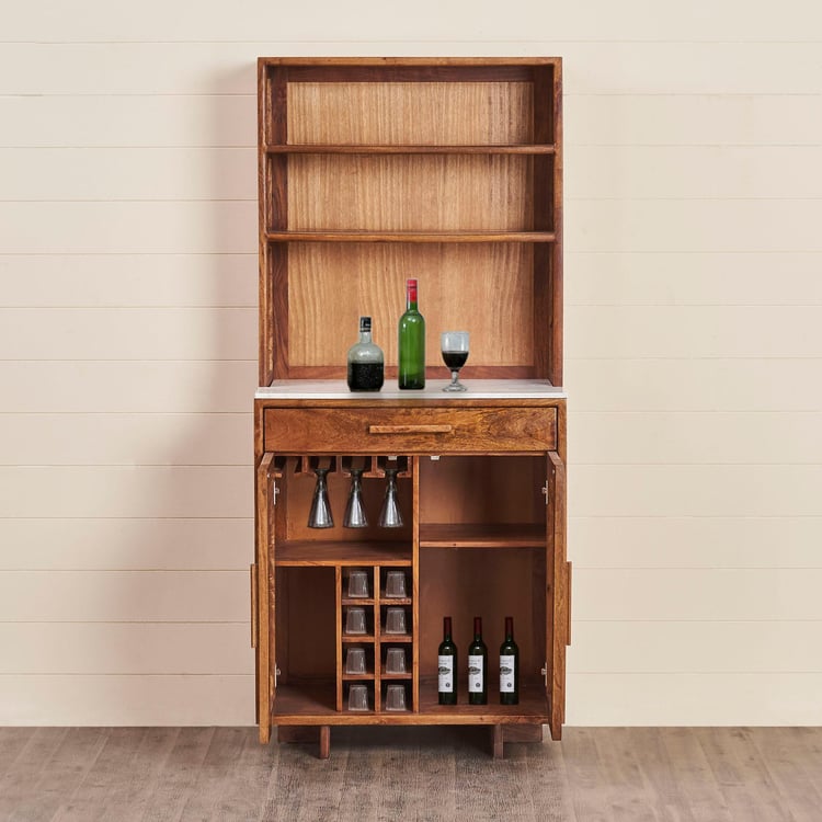 Carefully selected single slab of real marble without any blemishes for usage on furniture. This bar unit is ptimally cut and polished to add lusture to the natural patterns on stone. Heat, scratch & stain resistant thus easy to maintain over long term usage MADE UP OF MANGO+ACACIA+CANE Acacia wood is workable natural affordable material. It is sustainable and scratch resistant and has varying grain pattern. It resists damage from water, mold, and even fire. Acacia is a sustainable wood because the trees and shrubs grow so quickly. Those harvested for use can be quickly replaced. Mango�s hardwood consists of very dense grain that is durable, strong and not too hard on tools during woodworking. It can easily be cut and re-shaped into any form. The fiber grains are packed so close one to another that the surface can receive a very high level of polish and is also friendly to waxing and staining Cane - Cane is good at its Appearance and Style Backpanel - It is engineered wood with smooth surface with no grain makes it easier to work and paint. It is resistance to termite and wood borer. Solidwood is stained & covered with protective layer for making the furniture scratch, heat and stain resistant helping to increase durability. Wood is Kiln dried & excess moisture content is removed. This is to ensure warping, cracking of wood & improve durability. Wood is Fumigated to erradicate Borer and Termites. Solid wood components are fumigated before and after fabrication to eliminate mites infestation. Storage Type - Six fixed shelves and one fixed drawers Holder for safely stowing wine bottles Manual hinges for regular open close function.