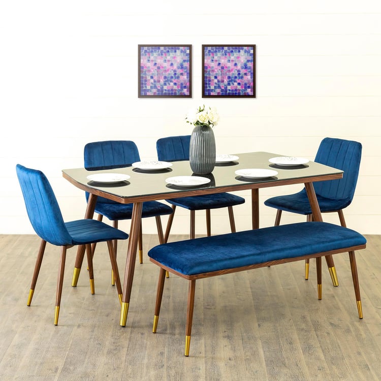 Noir Novelty Glass Top 6-Seater Dining Set with Chairs and Bench - Blue