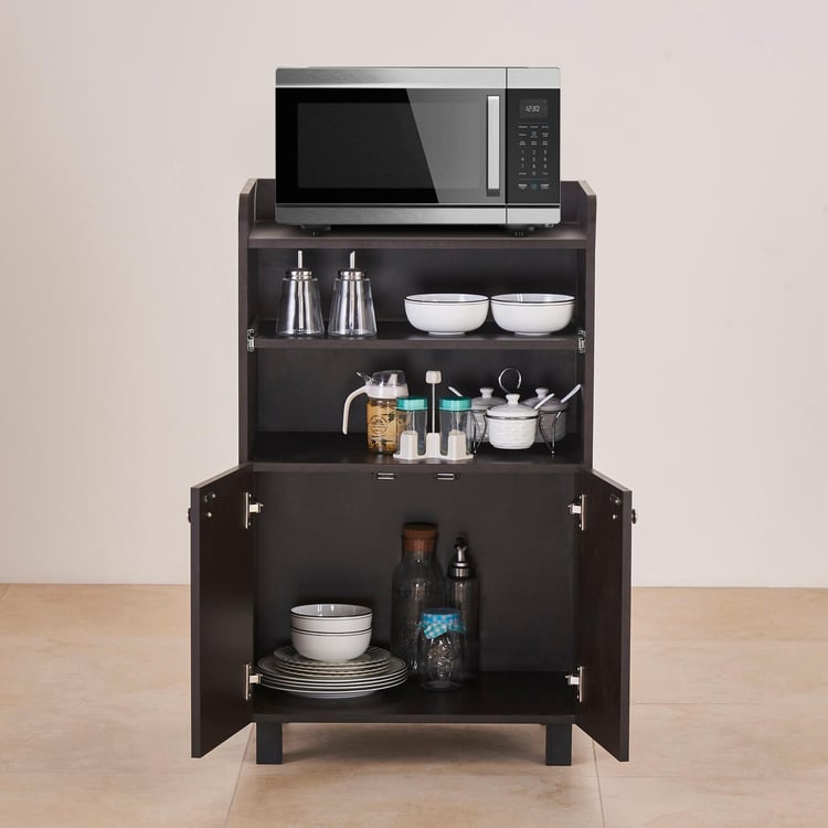 This cabinet is made of E2 grade engineered wood, it is made of multiple wood chips blended with Resin and additives formed in a conveyer belt followed with hot-pressed to compact the particles together and cure the resin trimming and cutting. It comes with a shutter door storage to keep the kids away from items like chilly powder, knives and sharp tools. The edges of the particle board is covered with PVC edge banding to arrest the sharp edges and core visibility. It is coated with melamine for scratch resistance.