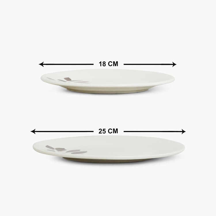 4 Dinner Plates, 4 Side Plates, 4 Katori, 1 Cereal Bowl, 1 Serving Bowl