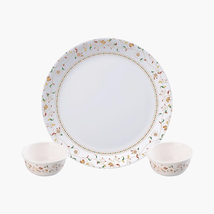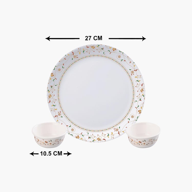 Bring convenience to your dinner table with this classic dinner set that comprises of eighteen separate pieces for unmatched convenience. It consists of six dinner plates and twelve veg bowls. It has been crafted from fine-quality material for extended durability to add a refined touch to your dining experience. It is made of food-grade material with longlasting designs and has a non-toxic and hygienic surface that is perfect for everyday use.