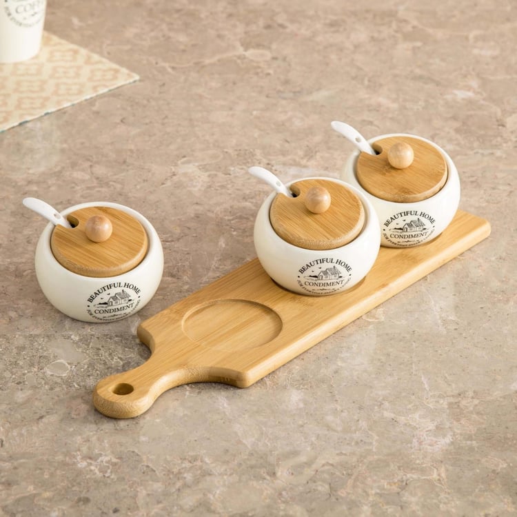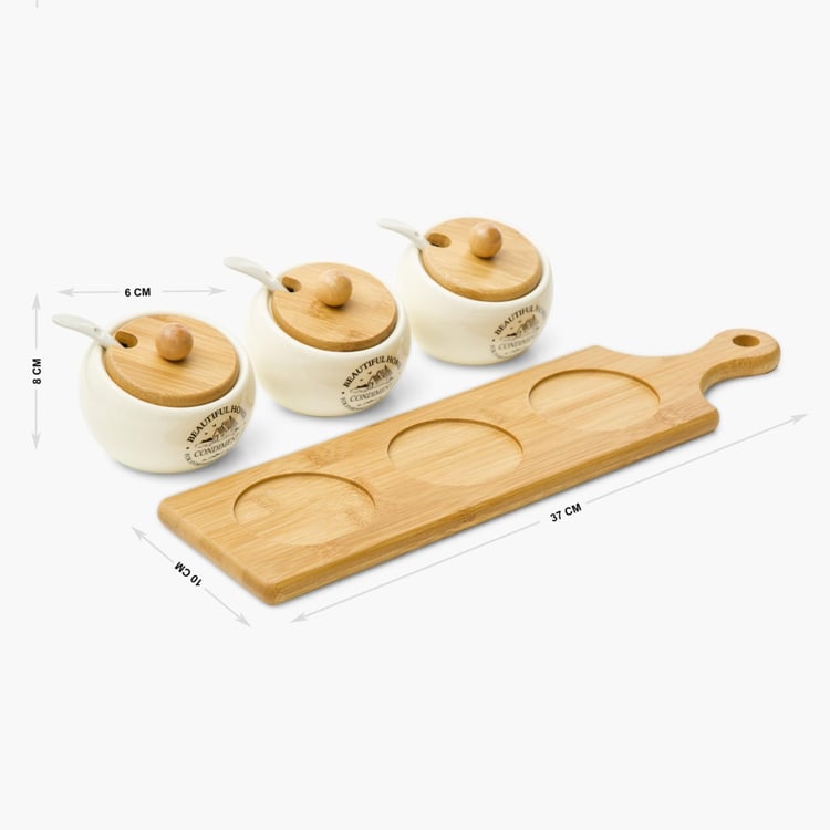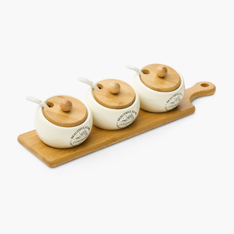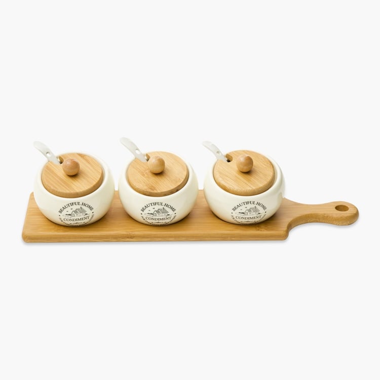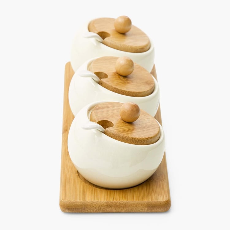 Beautiful Home Ceramic 3-Piece Condiment Set with Bamboo Tray & Spoons