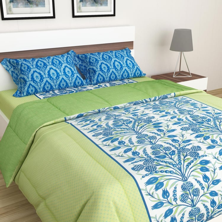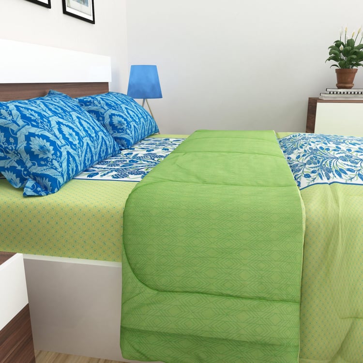 A double bed comforter set of four pieces, that comes with a bed sheet, two pillow covers and a warm comforter. Crafted from soft cotton, it is defined by an eye-catching floral print on the surface to add a refreshing touch to your bedroom d‚cor while making sure that you stay warm and comfortable every time you snuggle in.