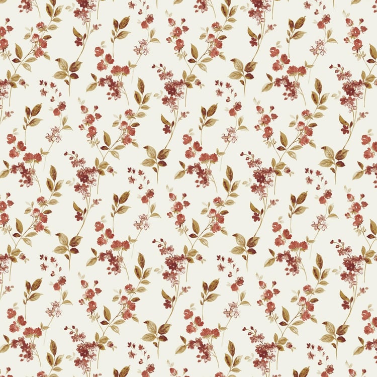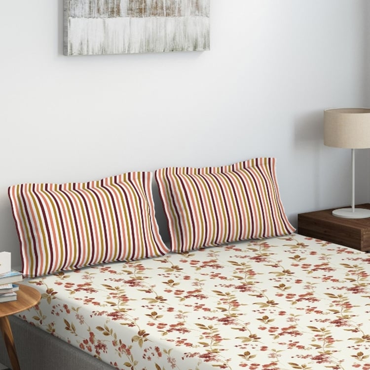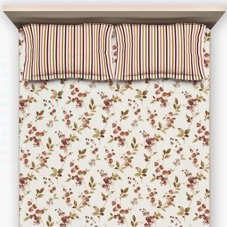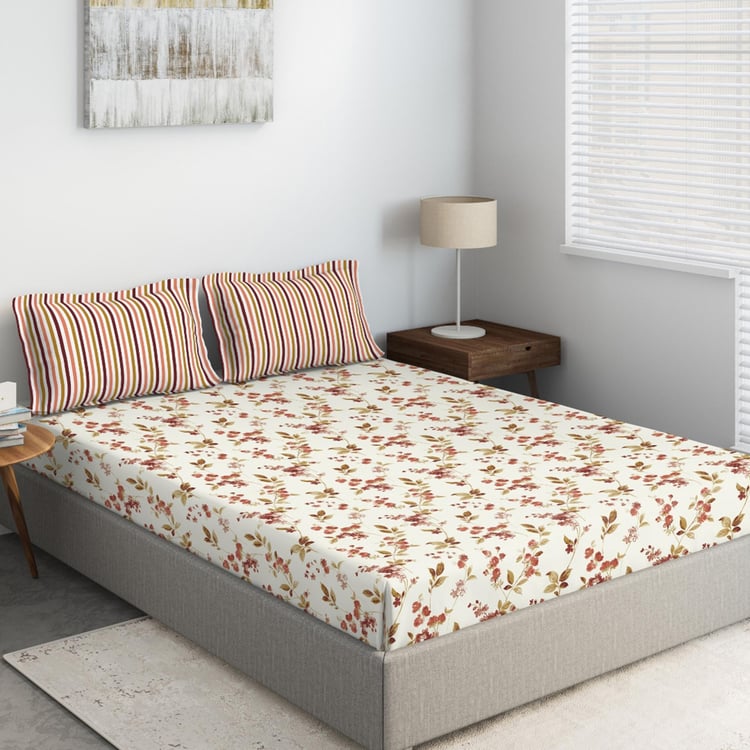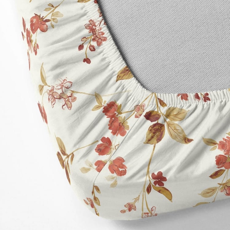 D'DECOR Alpha Off-White Floral Printed Cotton Fitted King Bedsheet Set - 182x198cm - 3Pcs