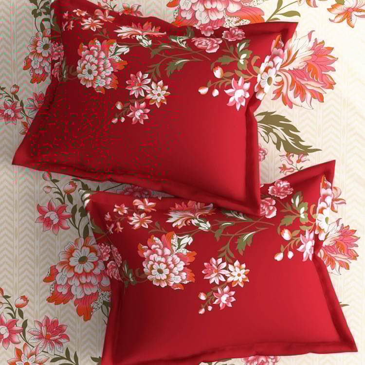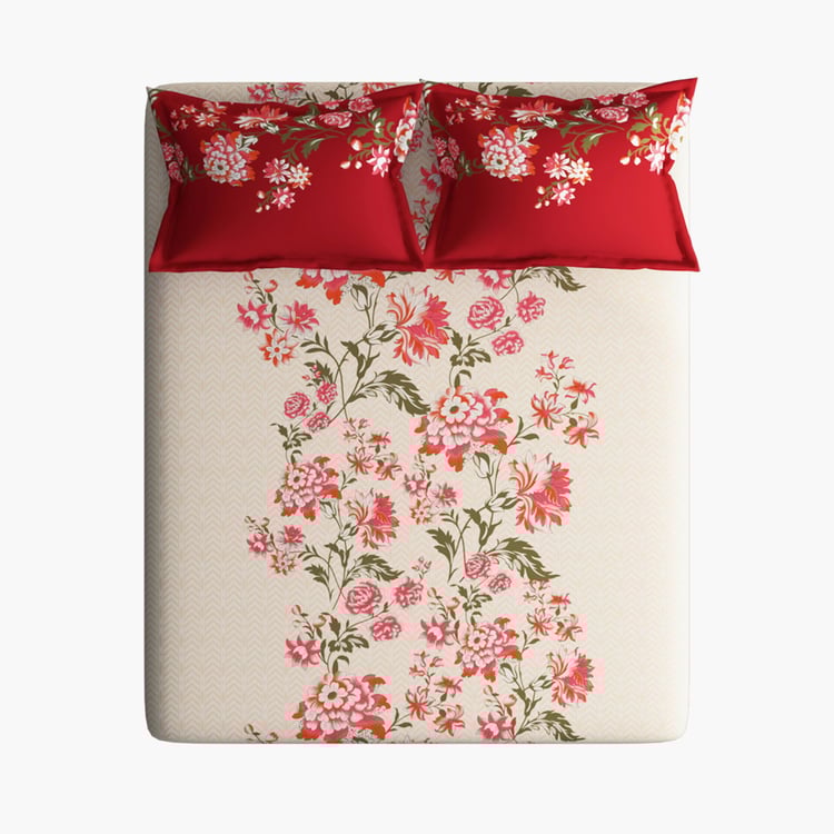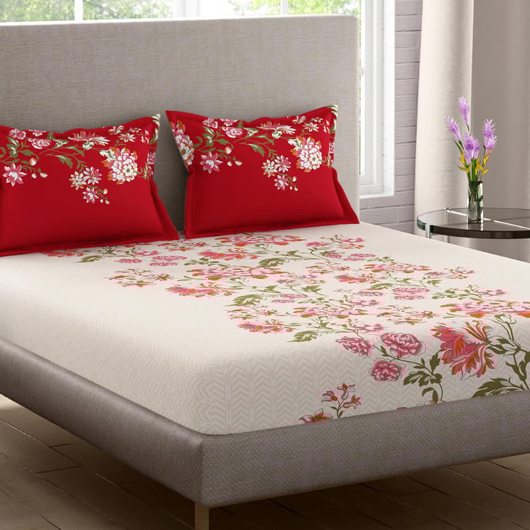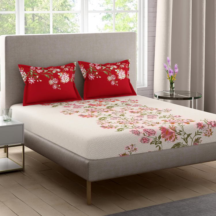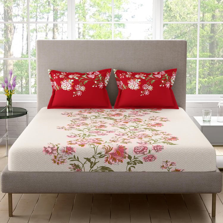 PORTICO Bliss White & Red Printed Cotton King Bedsheet - 224x254cm - 3Pcs