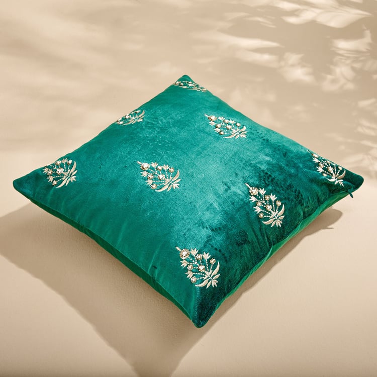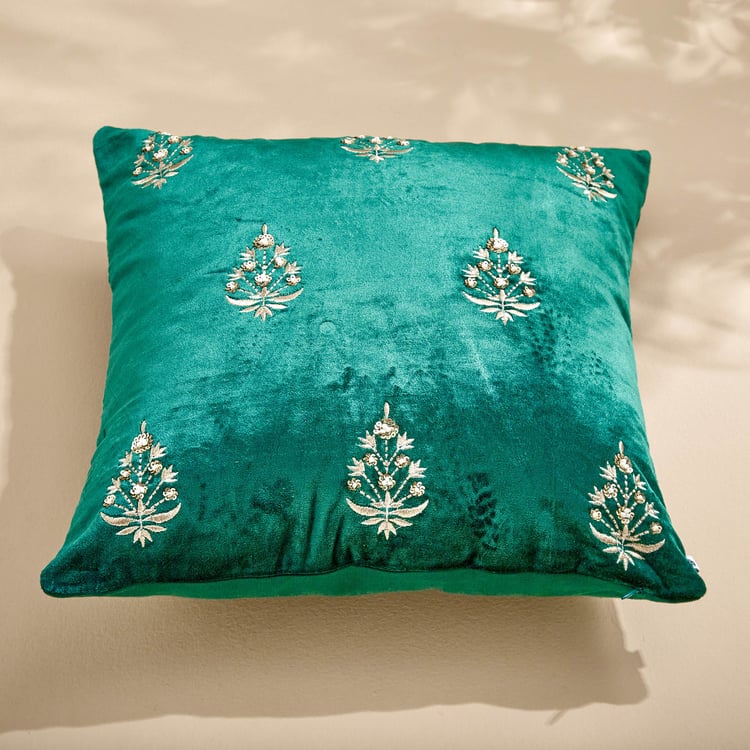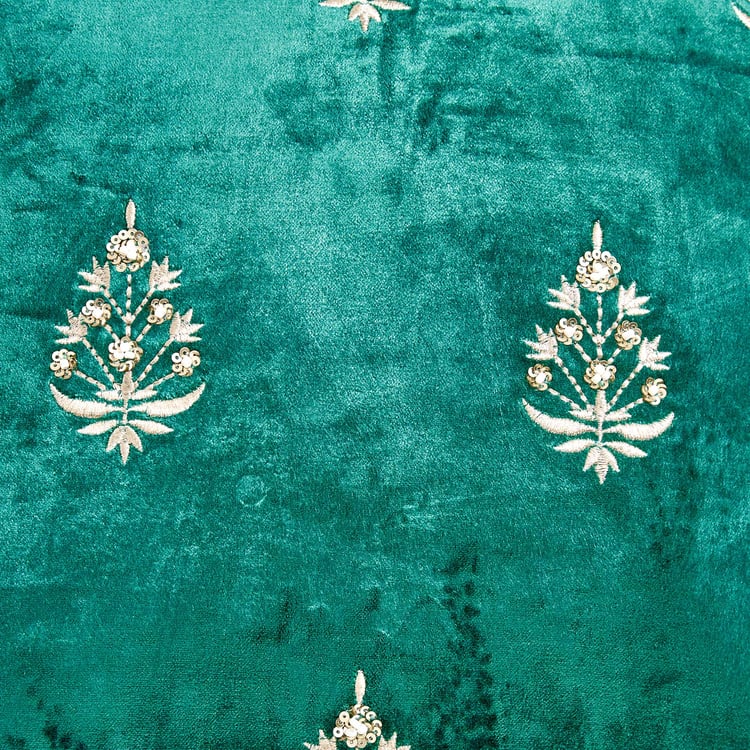 Add a regal touch to your decor with this cushion cover. The front is made from viscose with a velvet finish and the back features durable duck fabric. With a concealed zip for easy insertions, this cushion cover blends functionality with elegance seamlessly. The exquisite embroidery and sequin detailing draw inspiration from the intricate designs of the Mughal era.