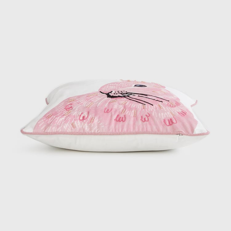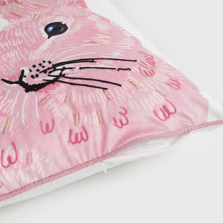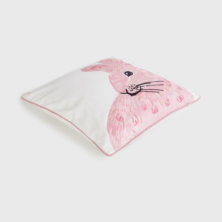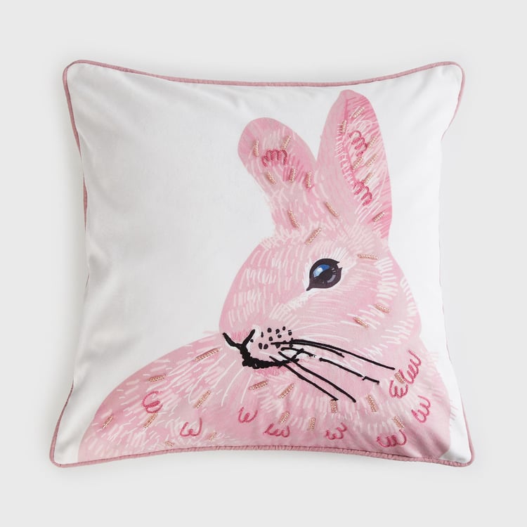 Enhance your decor with this cushion cover featuring a digitally printed bunny design with embellished accents. It is made from polyester fabric and comes with a convenient zip that makes it easy to insert the cushion.
