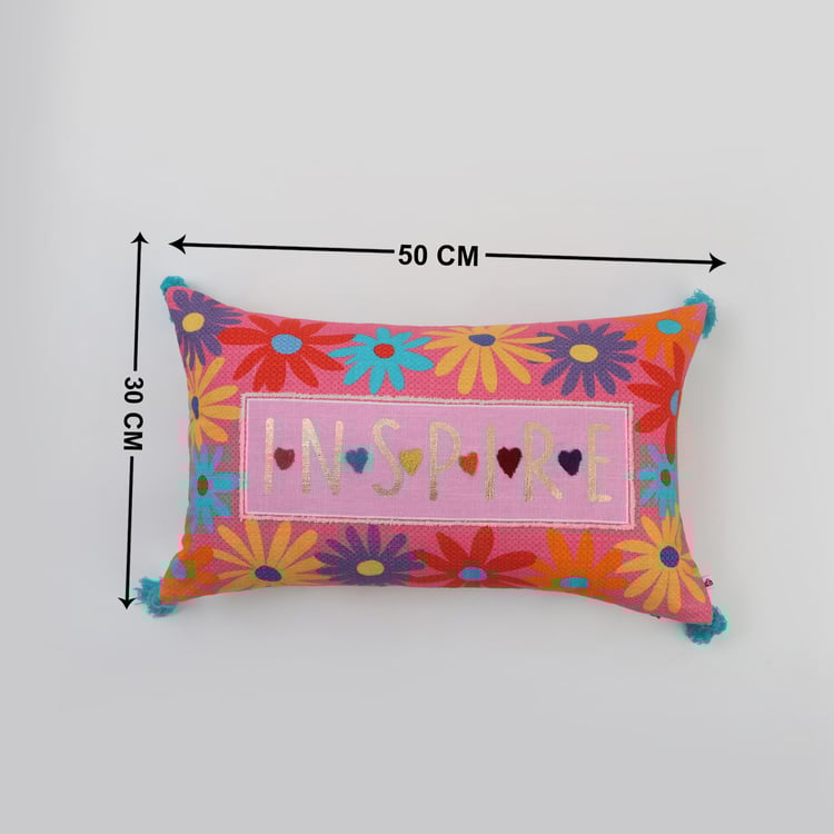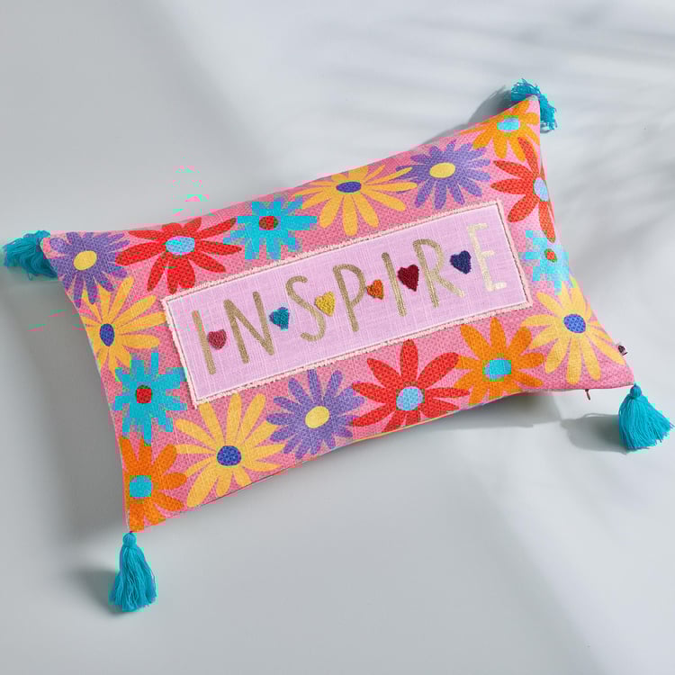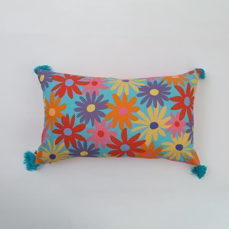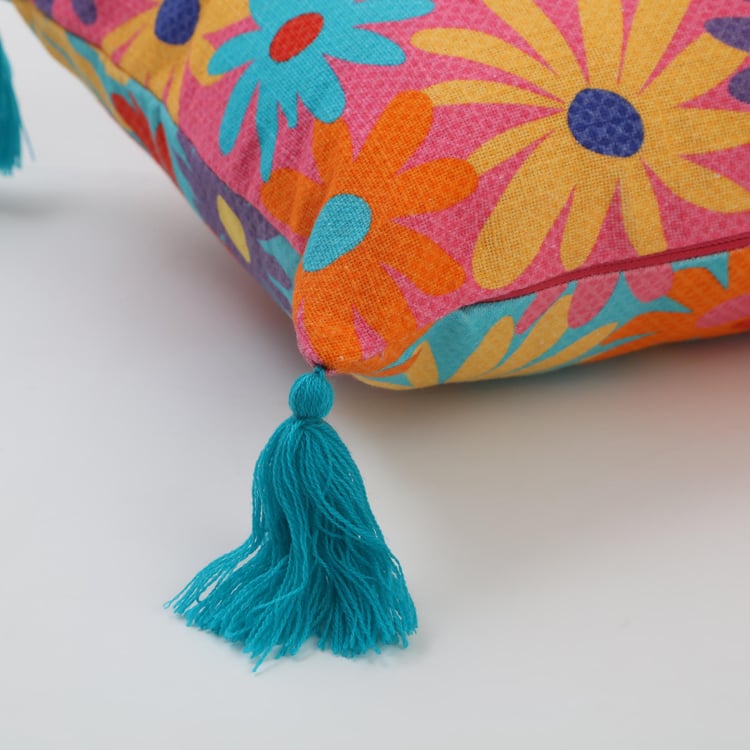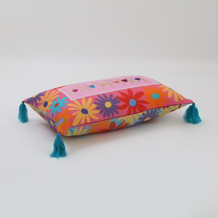 Brighten up your living room with this filled cushion. It flaunts a printed surface, rectangular shape, tassel details, and premium quality material.