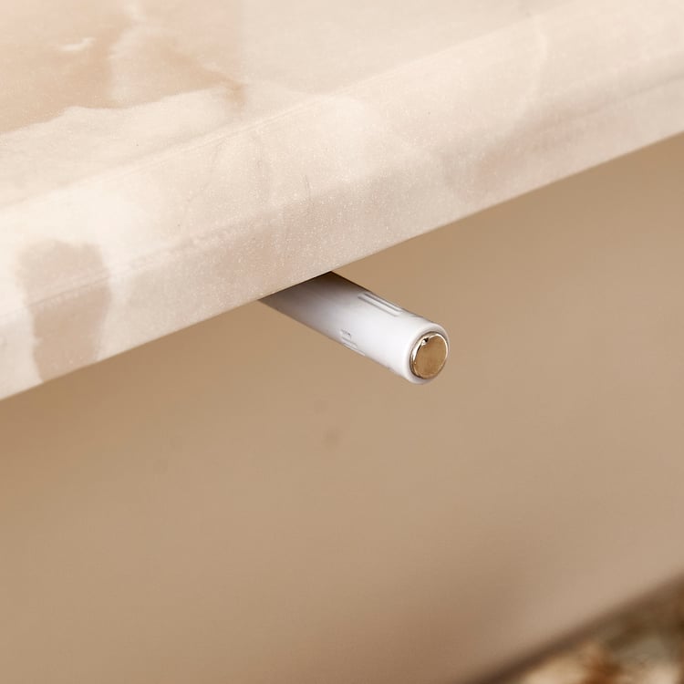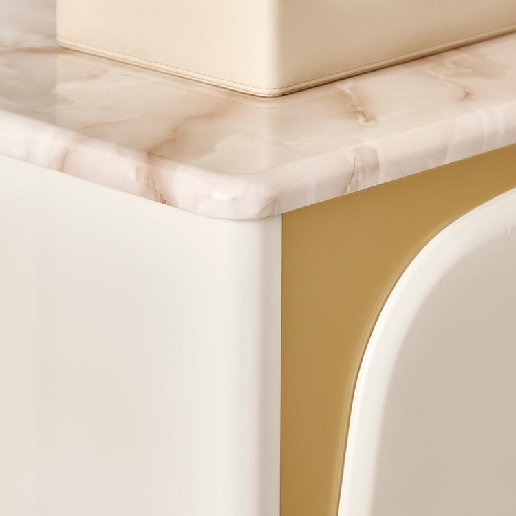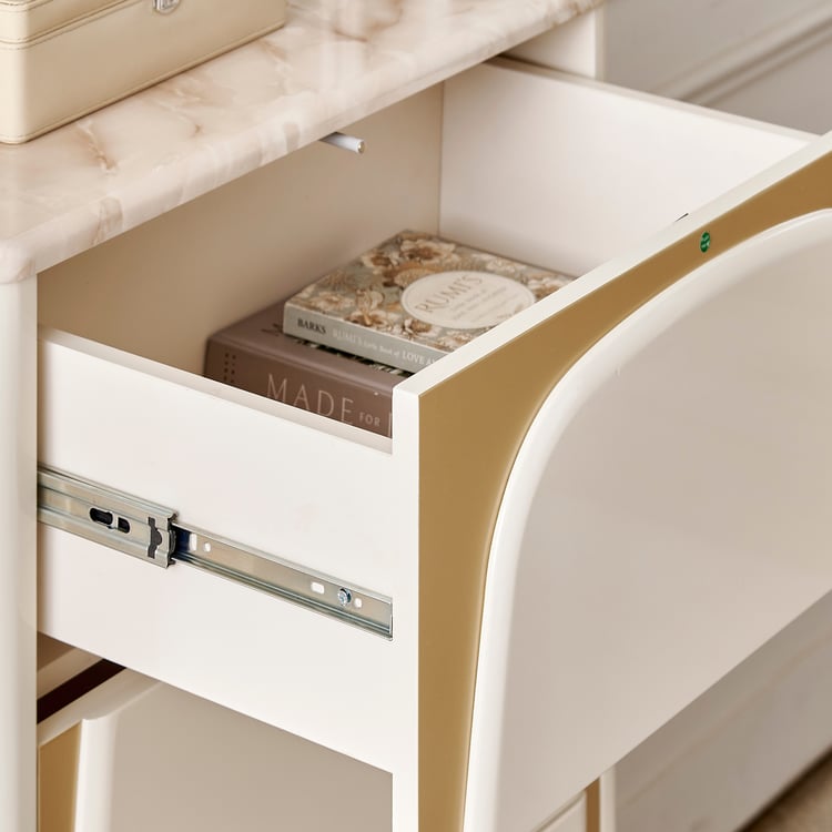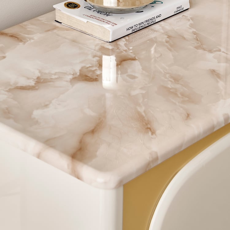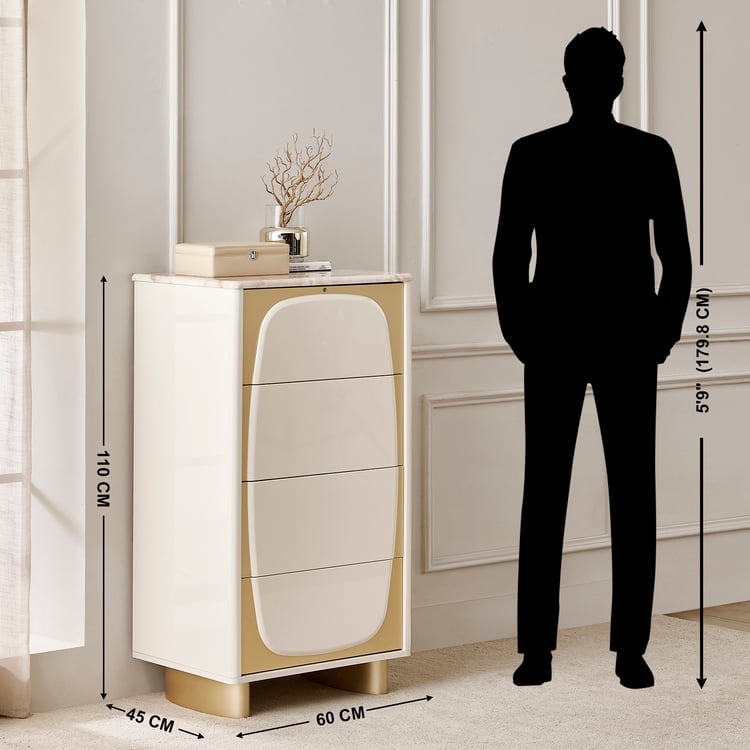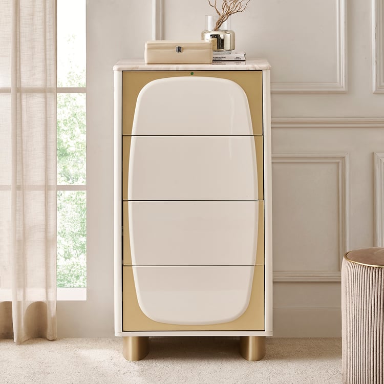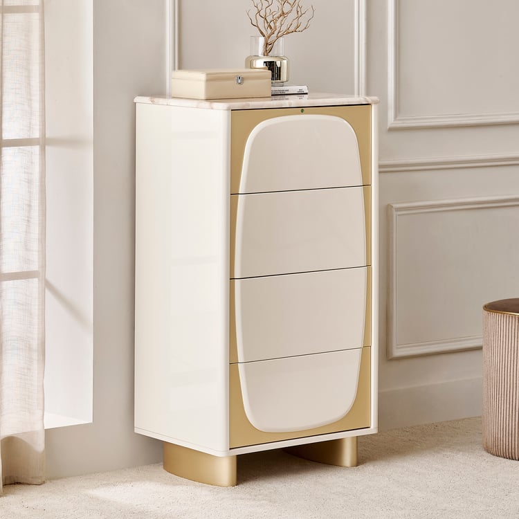 Add a touch of luxury to your space with the chest of 4 Drawers. Crafted from durable engineered wood, it showcases a smooth lacquer finish that provides a high-gloss, premium look. The printed paper marble top enhances the design with a sophisticated faux marble appearance that is easy to clean and maintain. Designed for functionality, this chest features four spacious drawers with a push-to-open mechanism and telescopic full-extension ball bearing runners for smooth and effortless operation.
