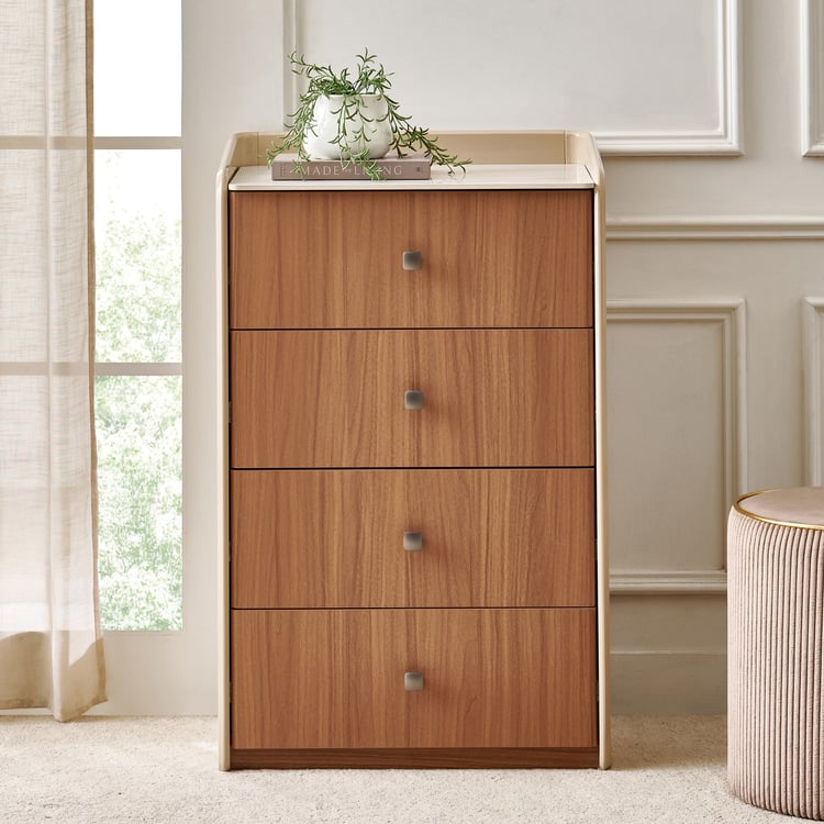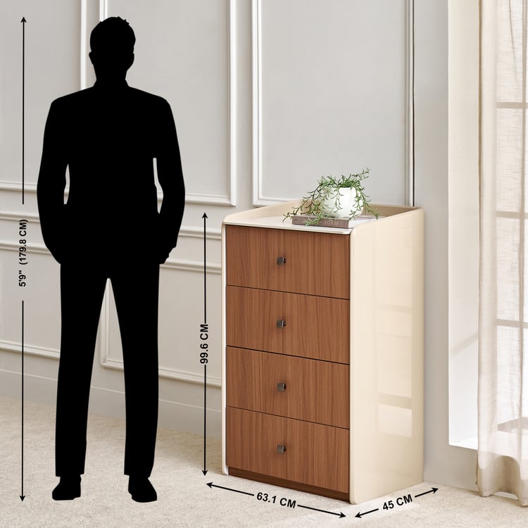 Add practical storage with a refined modern finish using the chest of 4 drawers. Crafted from E2 grade, high gloss engineered wood made with compressed fibre boards and hardwood extracts, it offers a strong core. Finished with glossy PU paint and melamine lamination for resistance to heat, scratches, stains, dents, and moisture, this chest features four spacious drawers with telescopic full extension ball bearing runners that support a 10–12 kg weight for smooth and reliable everyday storage.