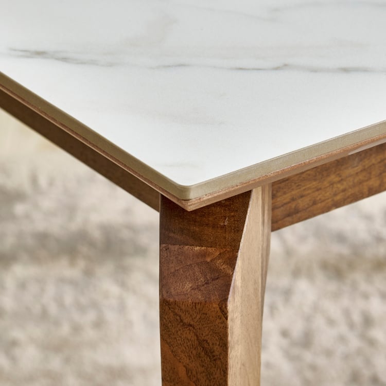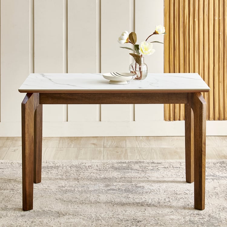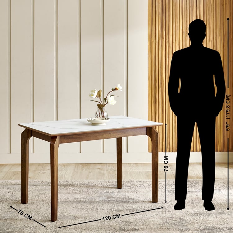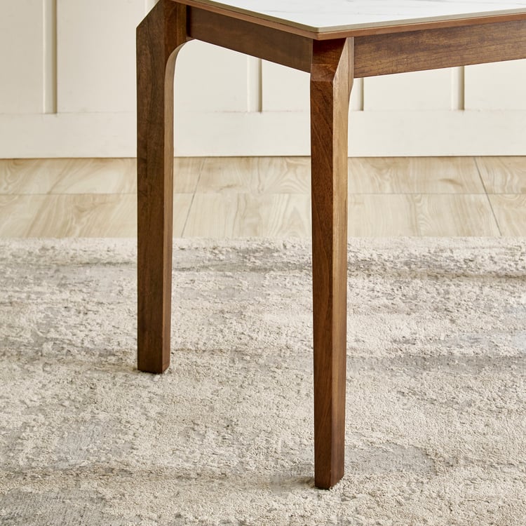 Create a warm dining space for shared meals and everyday conversations with this 4-seater table. The tabletop is made from ceramic that is non-porous and has superior resistance to spills, scratches, cutting, heat, and everyday wear. The supporting structure uses mango wood that has been kiln-dried and chemically treated for durability. Legs are engineered using laminated wooden panels that are sandwiched and boxed to enhance thickness, rigidity, and load-bearing performance.