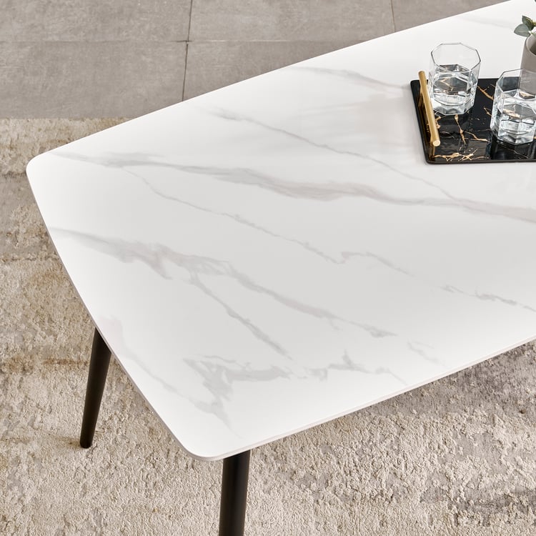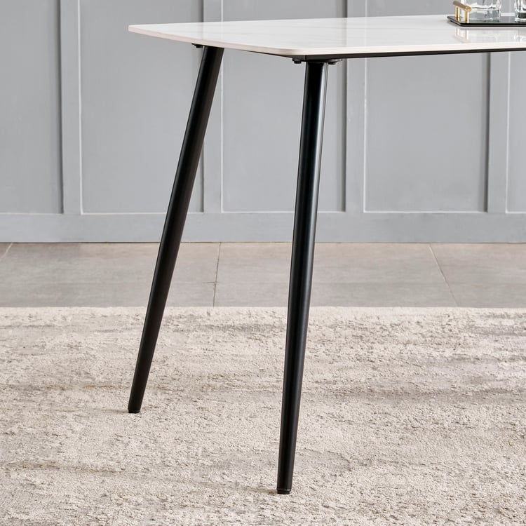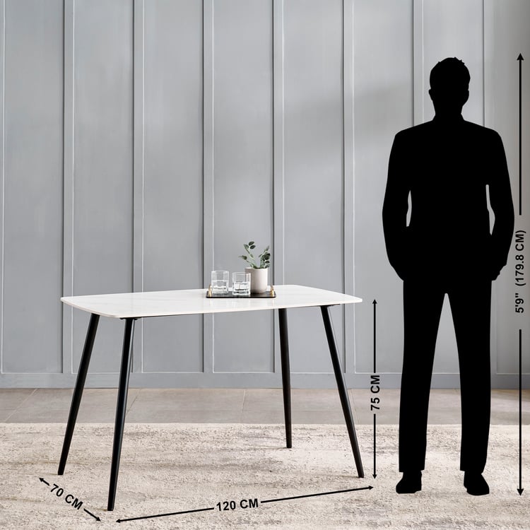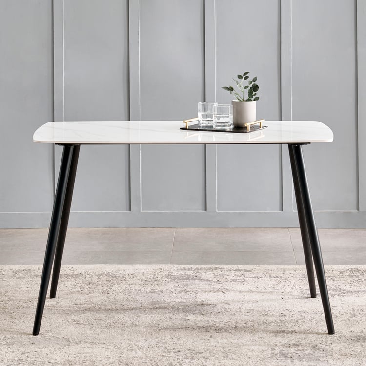 Bring modern durability to your dining space with this 4-Seater dining table. Its sintered stone tabletop is made from natural minerals fused under extreme heat and pressure, resulting in a dense surface that resists scratches, stains and heat. Supported by high-gauge mild steel legs, the frame delivers reliable strength and stability. Ideal for everyday use, it comfortably fits up to 4 chairs.