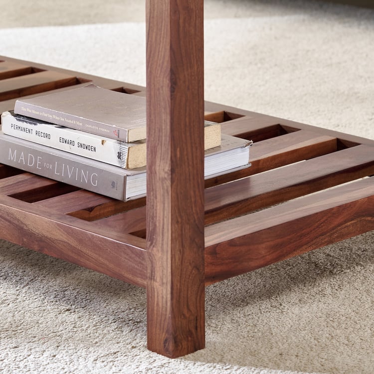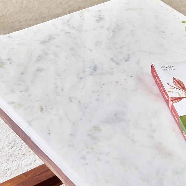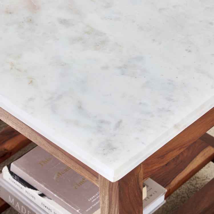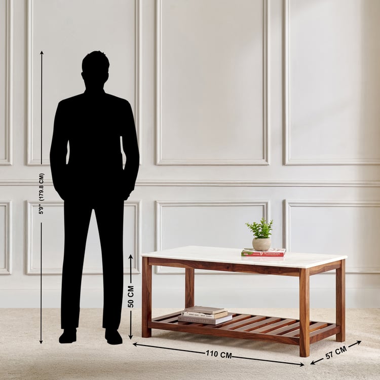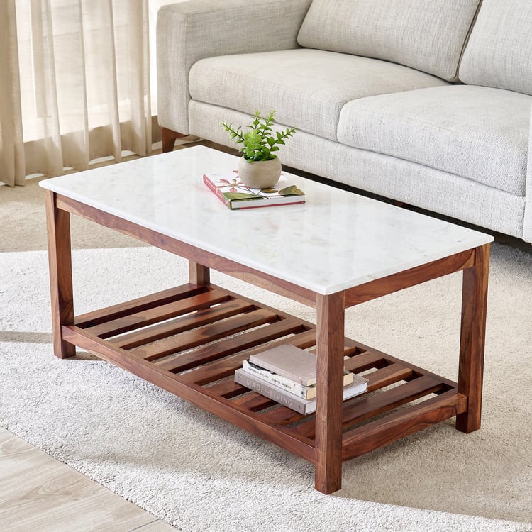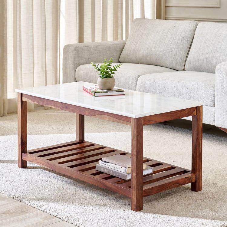 Crafted with a real marble top, this coffee table brings natural elegance to your space. It offers timeless beauty, durability and a naturally glossy finish that’s food-safe, heat- and fire-resistant. The base is made from Sheesham wood, adding structural strength and warmth. It includes a functional lower shelf for decor accents, books or daily essentials.