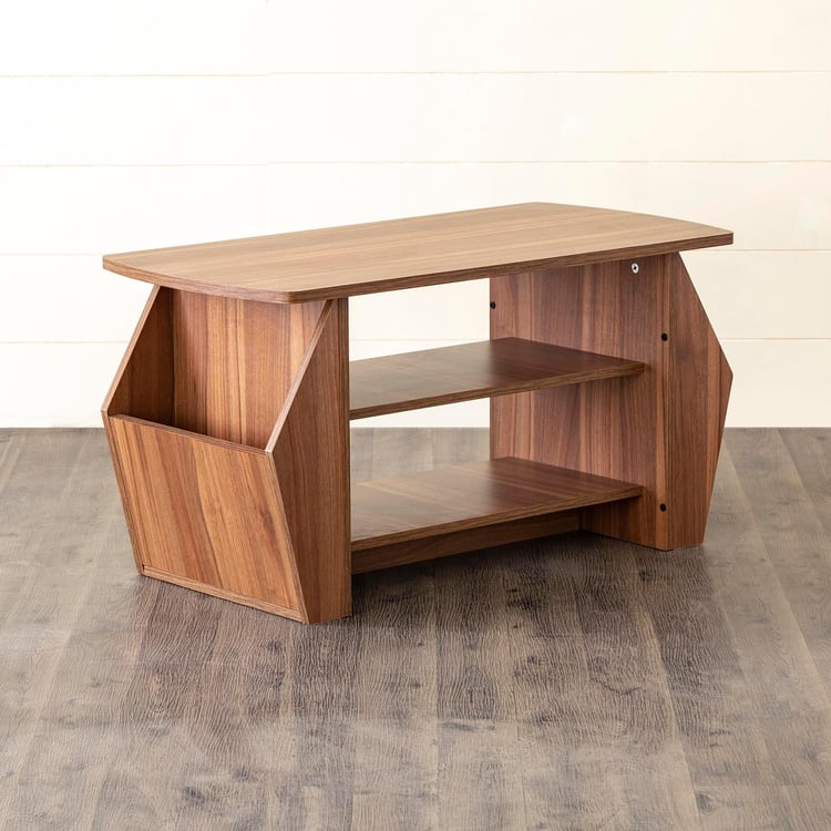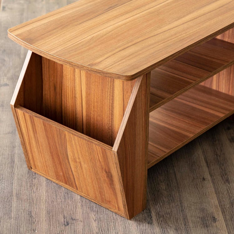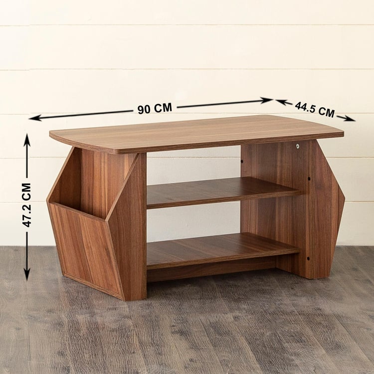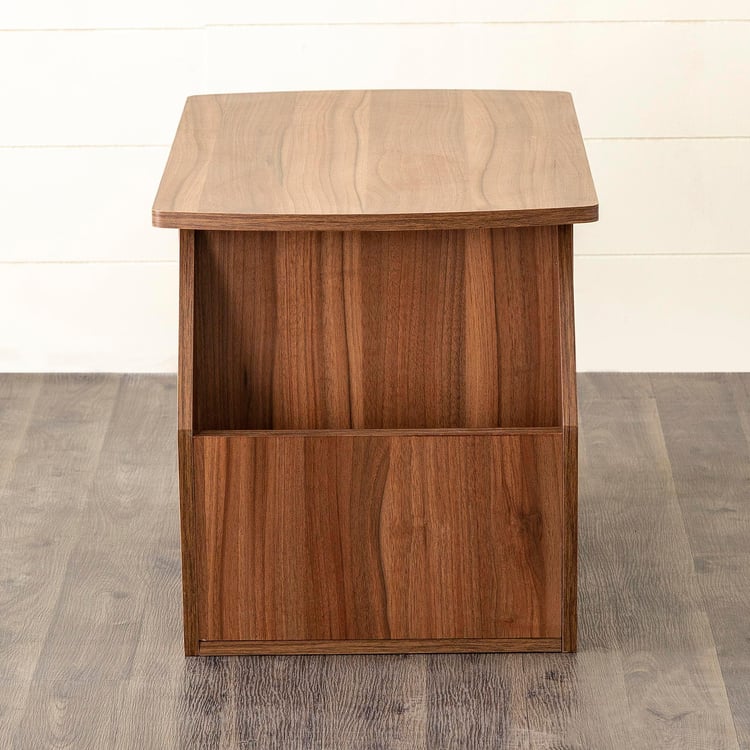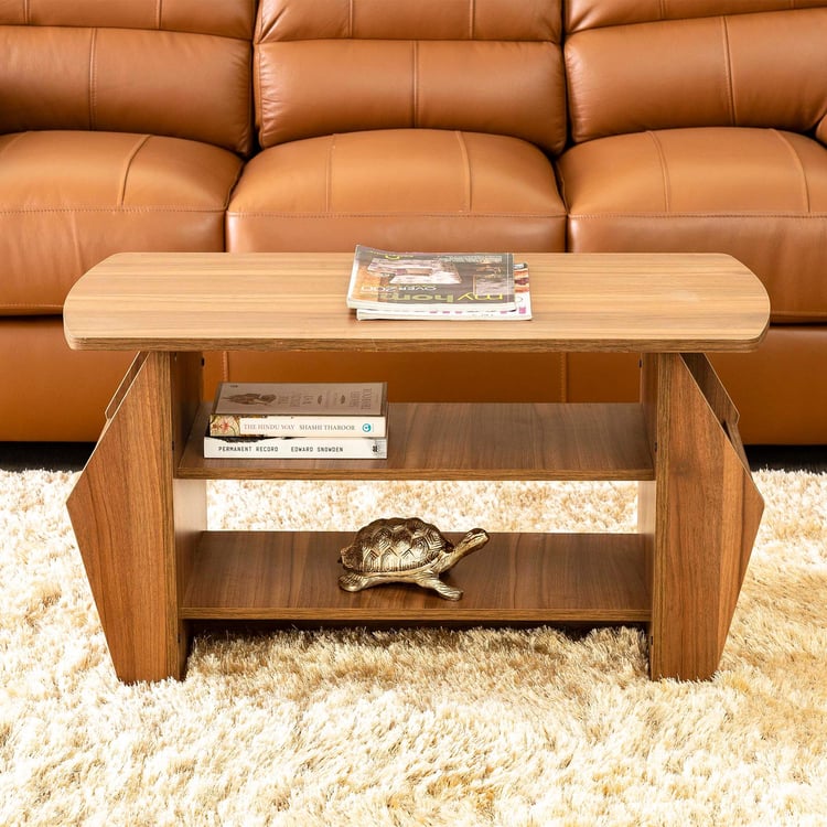 Enhance the look of your home with this coffee table that is made of prelaminated engineered wood with a high screw holding capacity making it durable over long term usage. The Table Legs is made of prelaminated engineered wood with a high screw holding capacity making it durable over long term usage. Finish type: Pre laminated 3D woodgrain laminate with melamine facing on both sides in wood grain colour which protects the substate from heat, scratches, moisture, stains etc. This helps to enhance looks & helping to increase durability. Finish type - 4 Side Edge Banding: High quality, machine pressed PVC edgebanding in matching colour to laminate on 4 sides ensures smooth finish along the edges thereby protects the core within from moisture or direct contact with water. Finish type - Melamine Finish: Pre laminated 3D woodgrain laminate with melamine facing on both sides in wood grain walnut colour which protects the substate from heat, scratches, moisture, stains etc. This helps to enhance looks & helping to increase durability. Treatment type - Formaldehyde Resin for lower emission: Engineered wood panels are pretreated with industry-standard chemical composition thereby making the core resistant to termite, borer and other mites. Certification - E2 boards: Engineered wooden panels used are certified European Emission standard E2 grade, thereby its certified safe for indoor furniture application. Additional hardware - PVC spacers, levellers: PVC Spacers under the panel avoids direct contact of furniture with floor and reduces noise while dragging the furniture Storage Type - Shelf storage: Shelving space below the tabletop offers plenty of space for keeping household articles such as newspapers, magazines, remote controls, mobile phones, etc., Storage Type - Pedestal storage: Unique design with pockets created on either side of the table offers additional space for organising and quick access of frequently used household articles. Load bearing capacity: 60-80 Kgs.