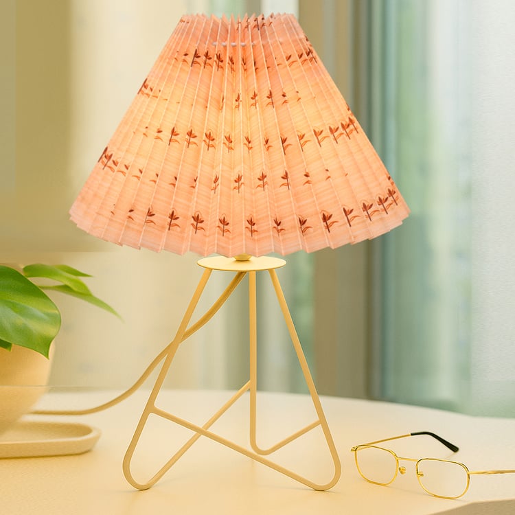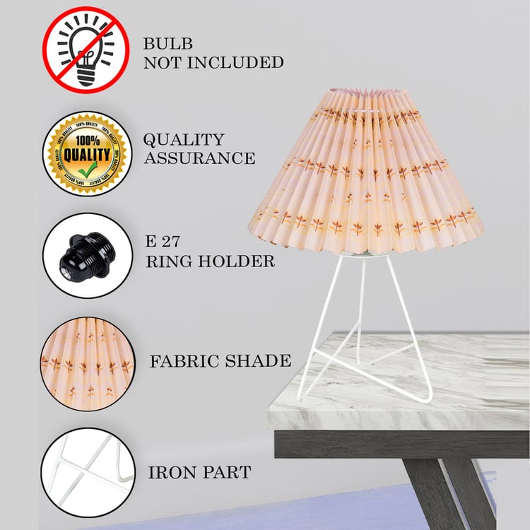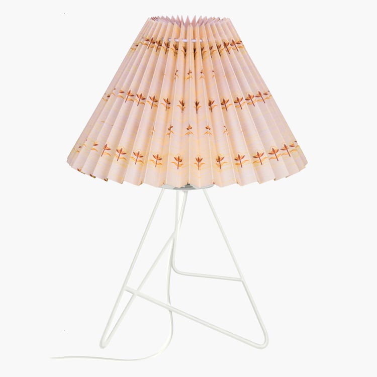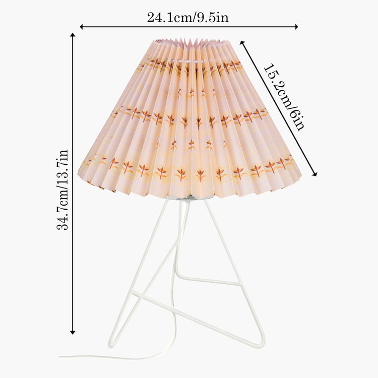 Bring timeless charm to your home with this elegant table lamp, featuring a pleated fabric shade adorned with delicate floral prints that casts a soft, inviting glow, paired with a beautifully crafted geometric tripod metal base that ensures lasting stability. Handcrafted in India with premium materials and fine craftsmanship, it includes a standard E27 holder (bulb not included) and a convenient two-pin plug, perfect for bedside tables, desks, or living rooms.