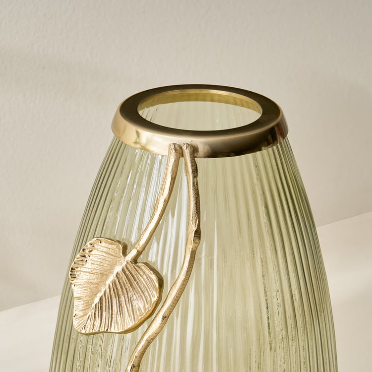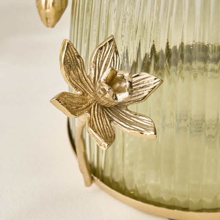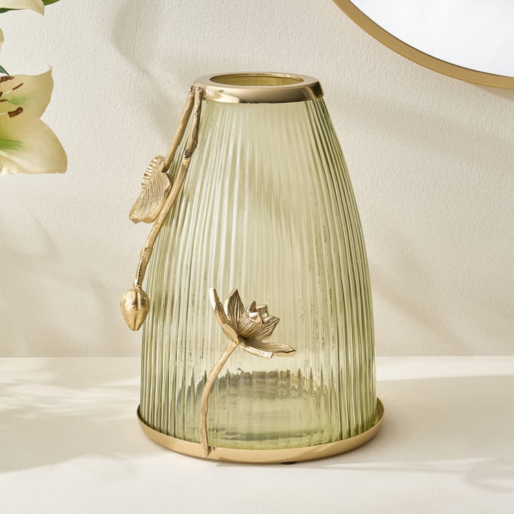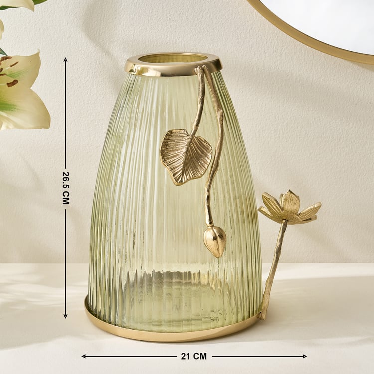 Enhance your decor with this elegant glass vase adorned with aluminium floral accents. Its refined design combines transparency and metallic charm, adding a sophisticated, artistic touch to any modern space.
