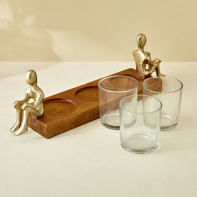 Add sophistication to your decor with these glass votive holders featuring a mango wood base. Their elegant design casts a warm, ambient glow, creating a refined and inviting atmosphere in any setting.