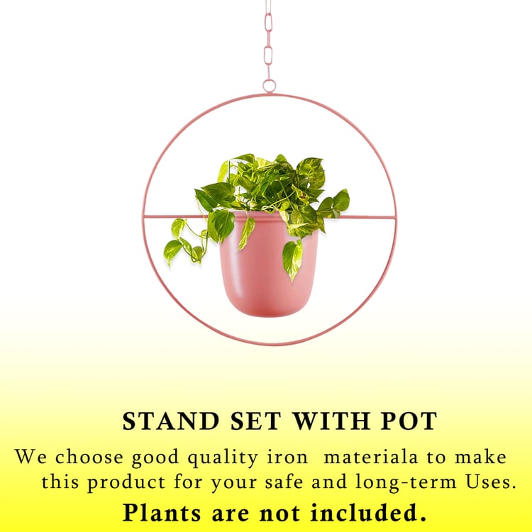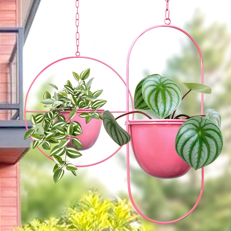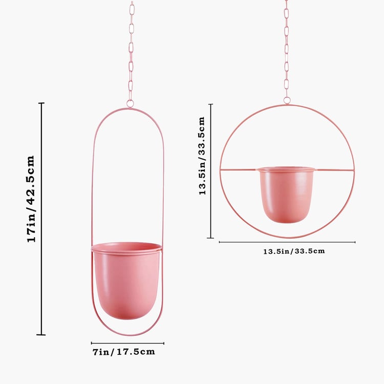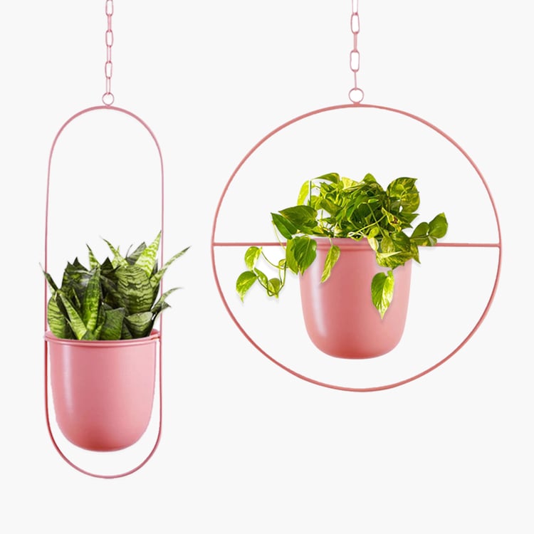 Add a modern decorative touch to your space with this metal hanging planter set, designed to elevate any interior or balcony. Crafted from durable iron, it includes two planters, one with an oval stand and another with a circular stand, each paired with a matching hanging chain for secure suspension. The minimalist metal frames beautifully highlight plants while offering long-lasting strength and stability.