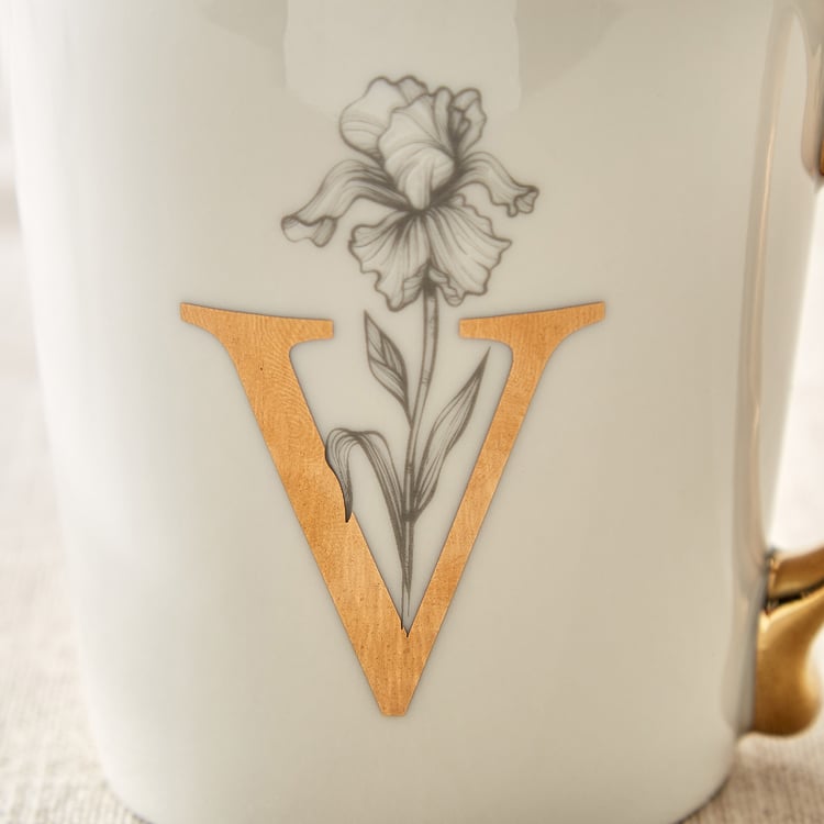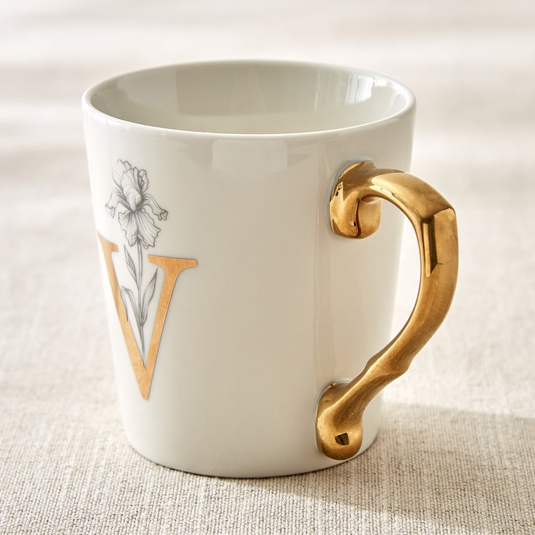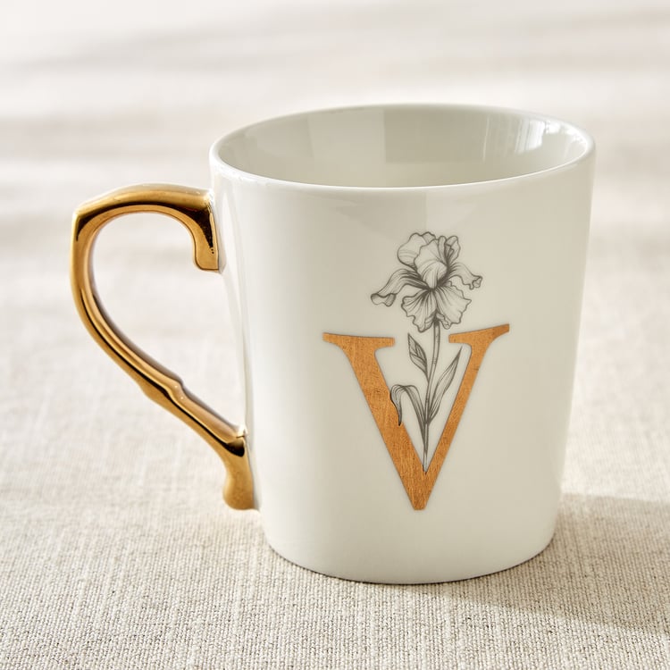 Start your mornings in style with your favorite brew in this printed coffee mug. Crafted from high-quality bone china, it offers a delicate, refined look while being exceptionally strong, lightweight, and chip-resistant. The finely printed letter “V” adds charm, while the radiant gold-finished handle lends an elegant touch. With a generous 350 ml capacity, it’s perfect for coffee, tea, or any hot beverage.
