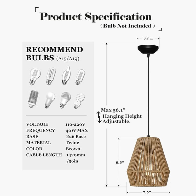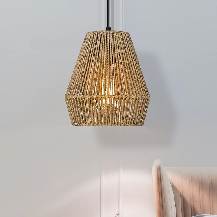 Enhance your decor with this handwoven rattan ceiling lamp, blending rustic charm and modern elegance. Its geometric-shaped shade showcases intricate weaving, casting mesmerising light patterns. Featuring a sleek metal canopy and E27 bulb holder (bulb not included), it adds a cosy, organic touch to any space.