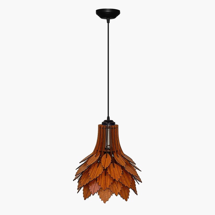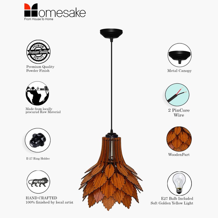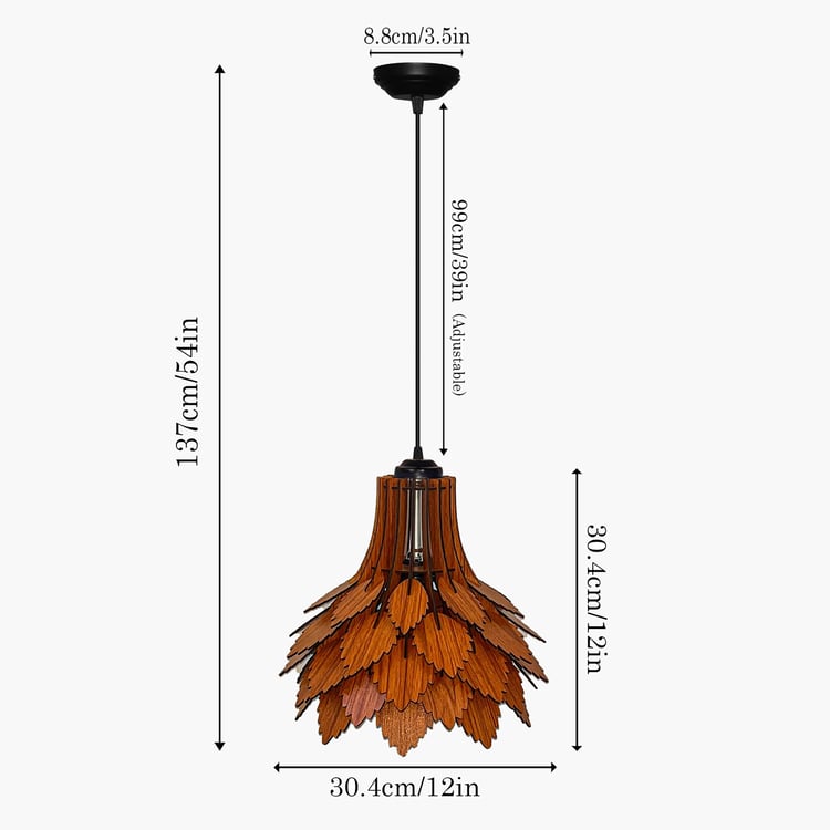 Elevate your interiors with this ceiling lamp, inspired by autumn leaves and crafted with artisanal finesse. Its layered wooden shade casts captivating shadows, filling the room with warmth and elegance. Designed with a sturdy premium metal canopy, it comes with an E27 holder and a warm glow bulb included, creating a cosy and inviting ambience.
