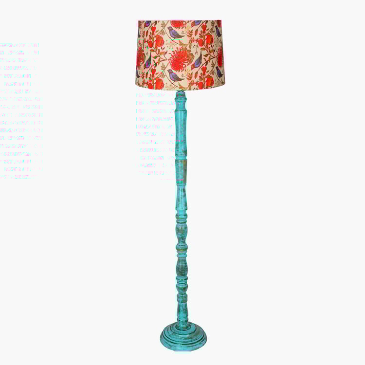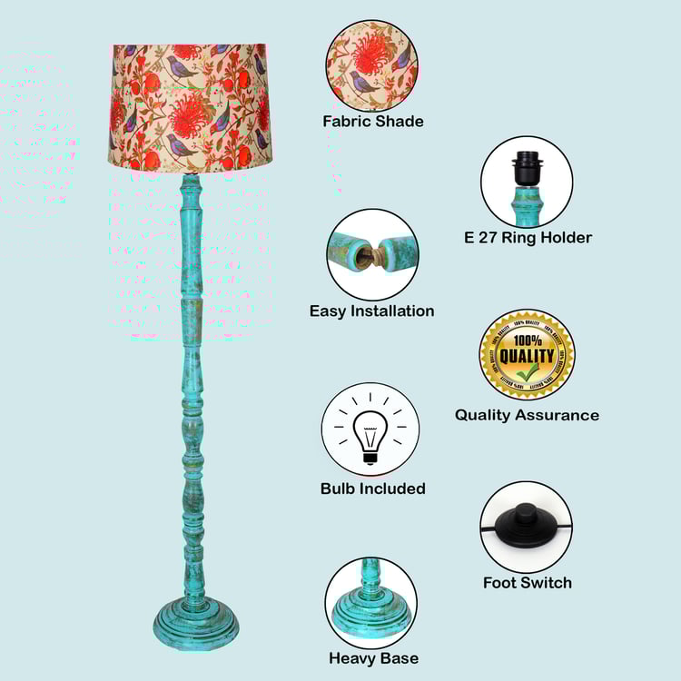 Add timeless charm to your home with this elegant floor lamp, featuring a rustic carved wooden stand and a vibrant printed shade. Designed for everyday ease, it includes a sturdy base, E27 bulb compatibility, and a convenient foot switch for effortless use.