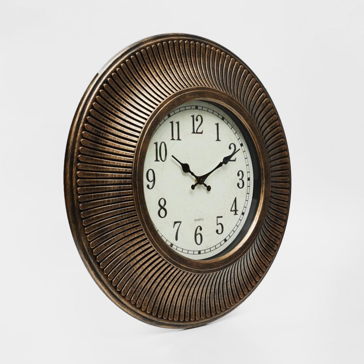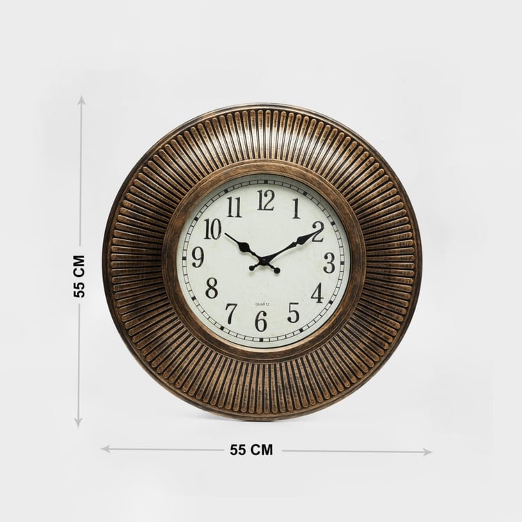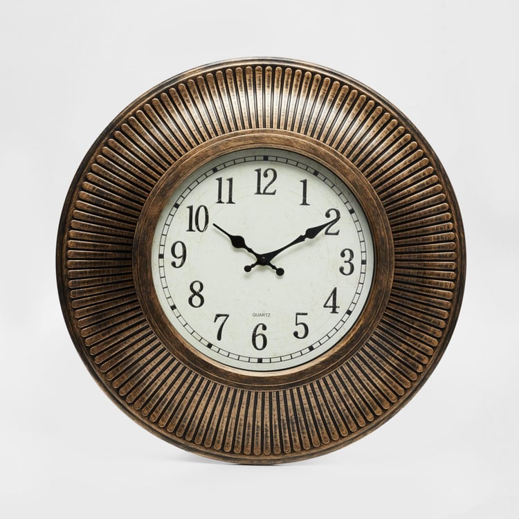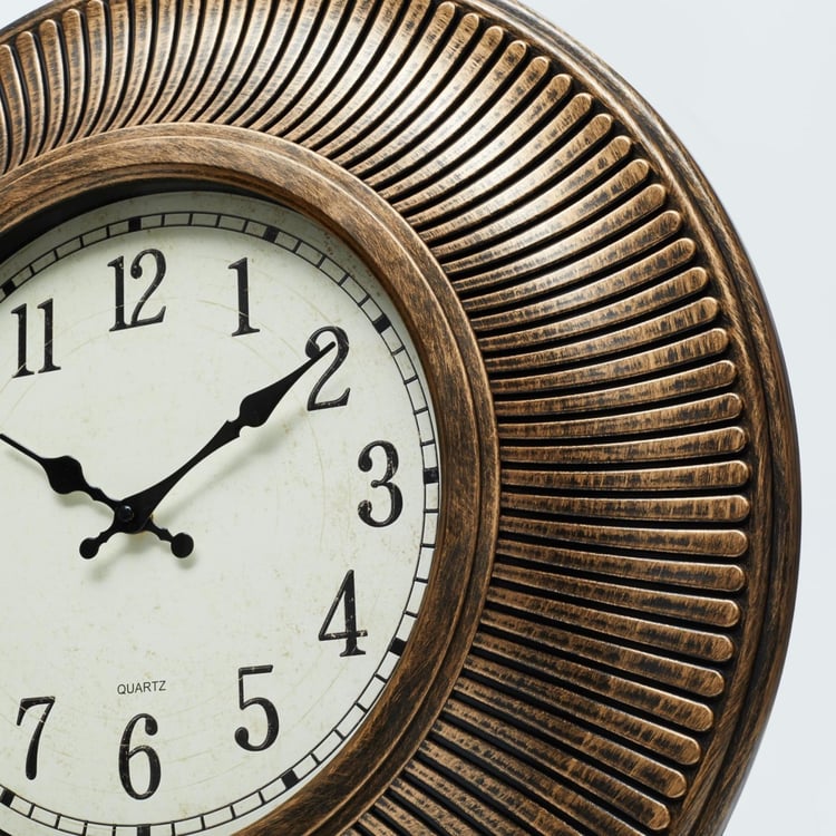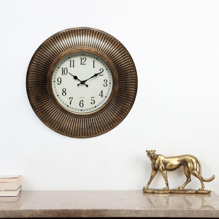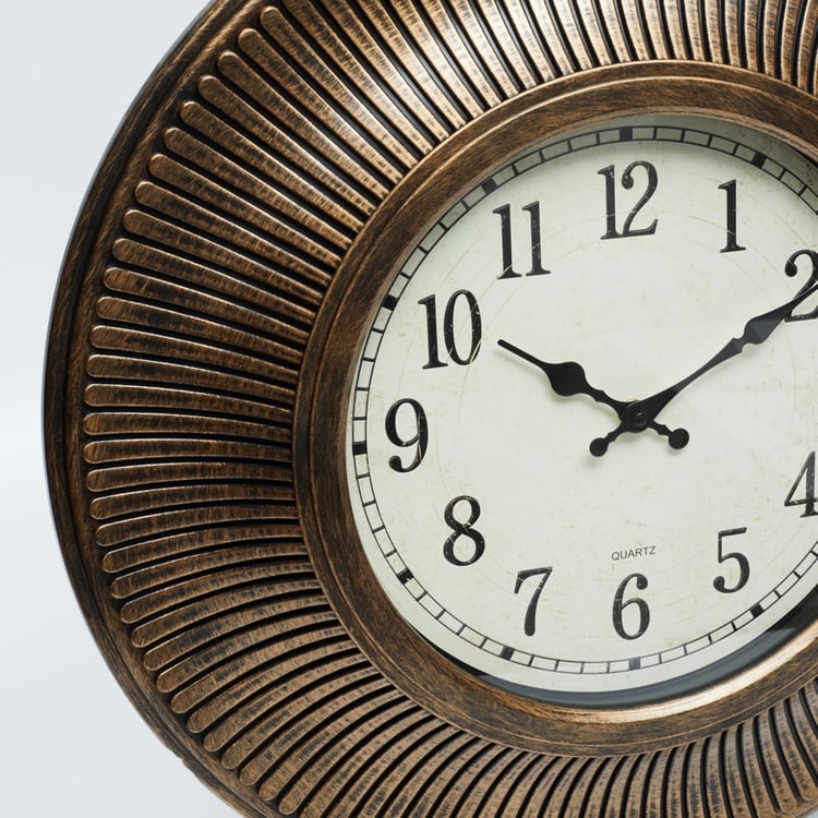 Designed into a round vintage wall accent with analog function, this wall clock makes for an elegant timepiece.