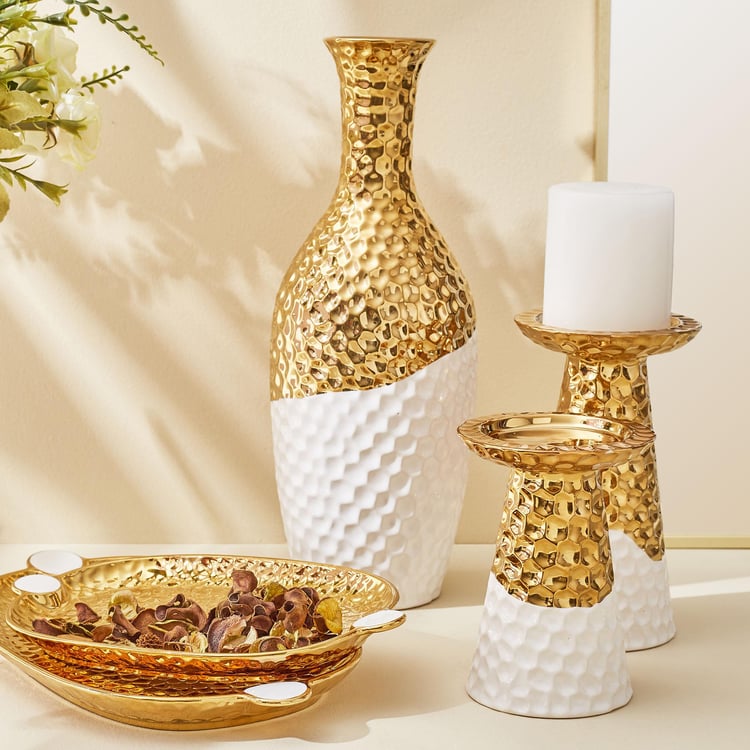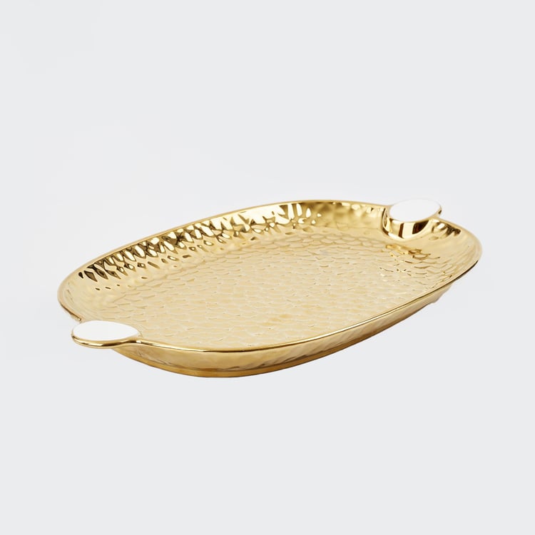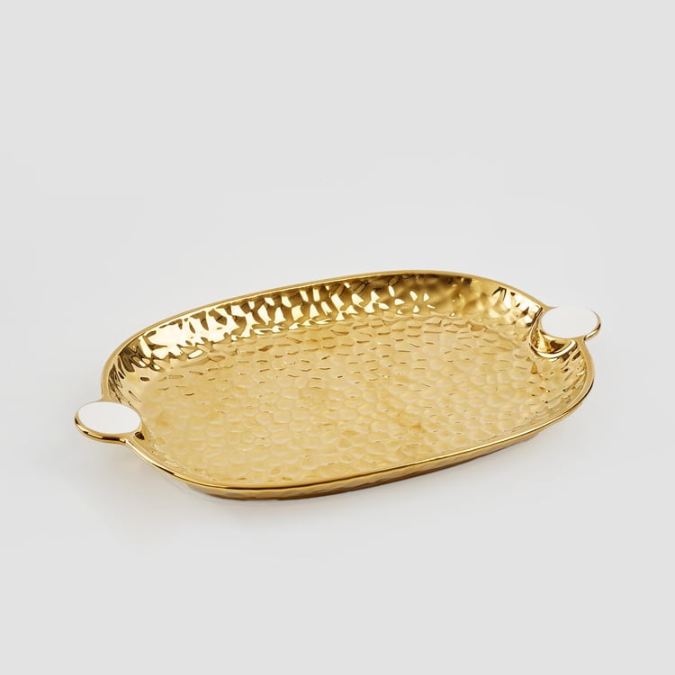 Use them anywhere in a room to create a charming spot or as a centrepiece. Made of polyresin, these decorative platters are sleek, modern, and very sturdy. This platter, which has a textured surface and a small handle for easy movement, will enhance the vision of your study table or office desk.