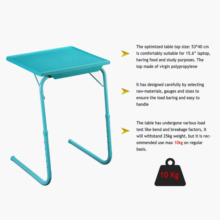 This tabletop which is made with virgin polypropylene is resistant to heat. CRCA powder-coated metal legs are built to last long. It comes with six adjustable heights and opens up to three different angles for a convenient posture. Being lightweight it is easy to fold and takes less space when not in use. It can withstand up to 10 kgs load when in use.
