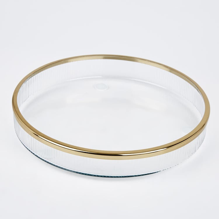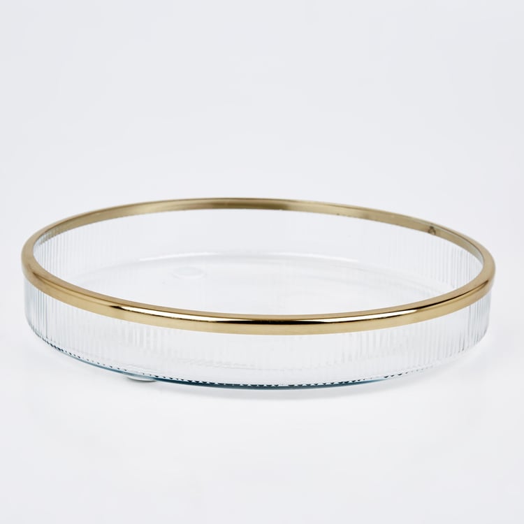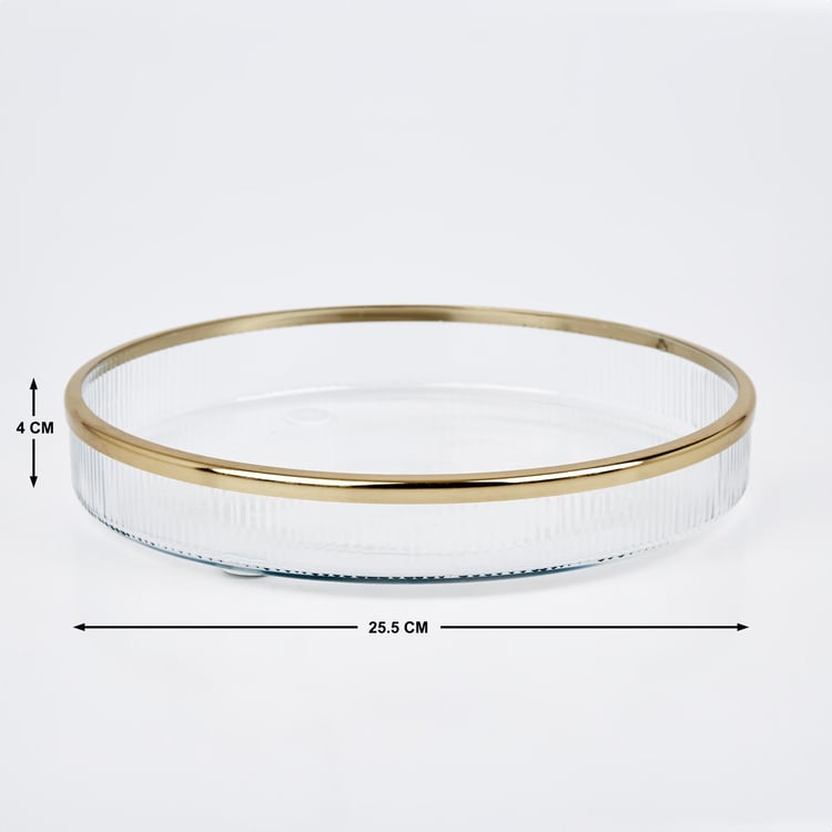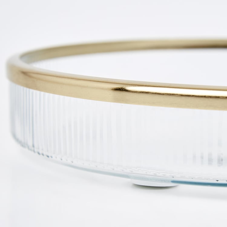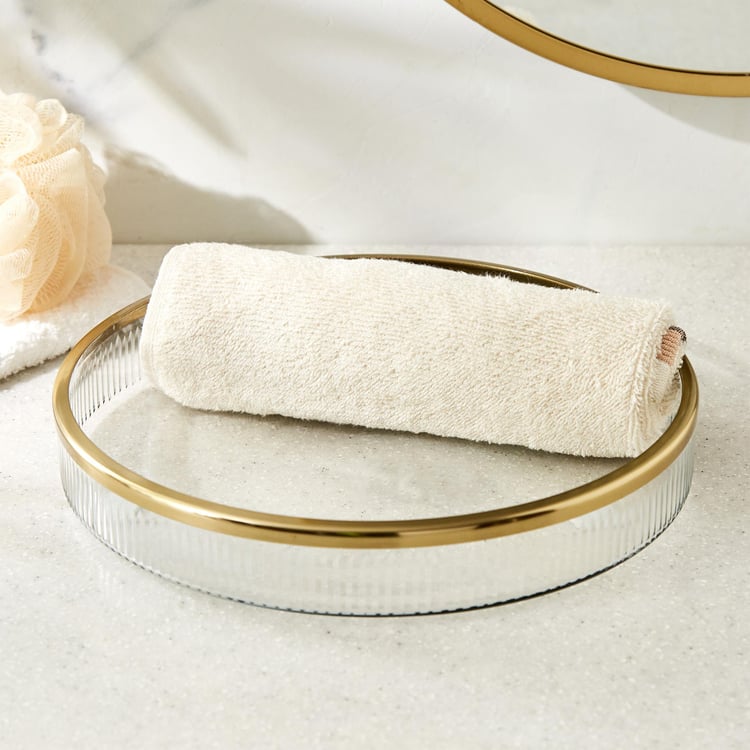 Keep your bathroom vanity counter stylish with this circular tray. It is made of glass with a ribbed design and a sleek rim for an elevated style. It is ideal for placing your jewellery or face towels.