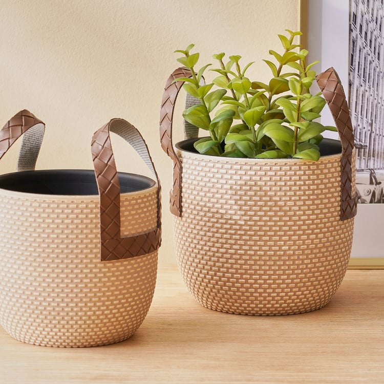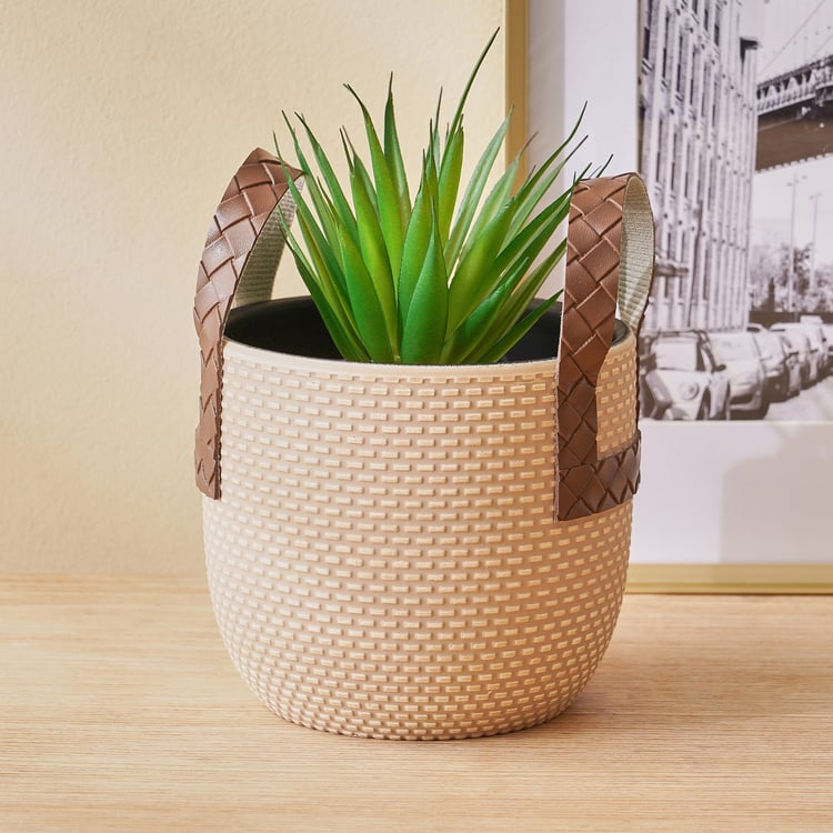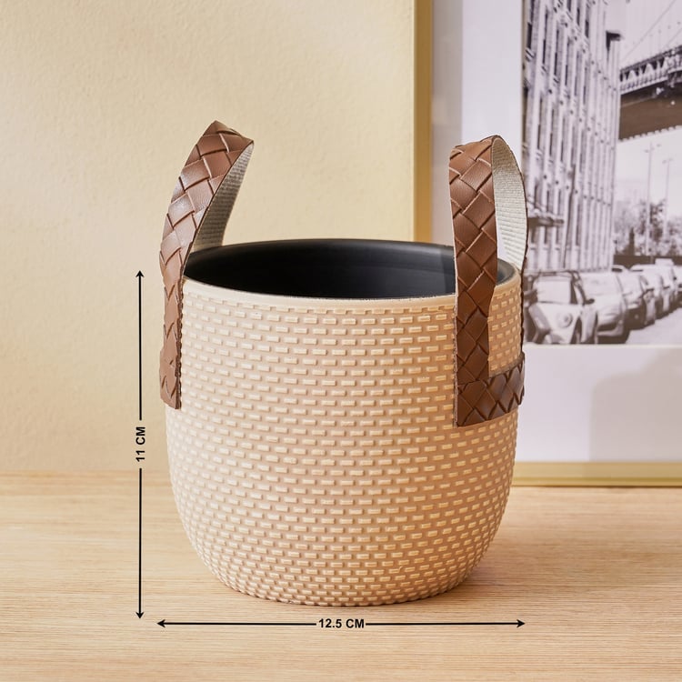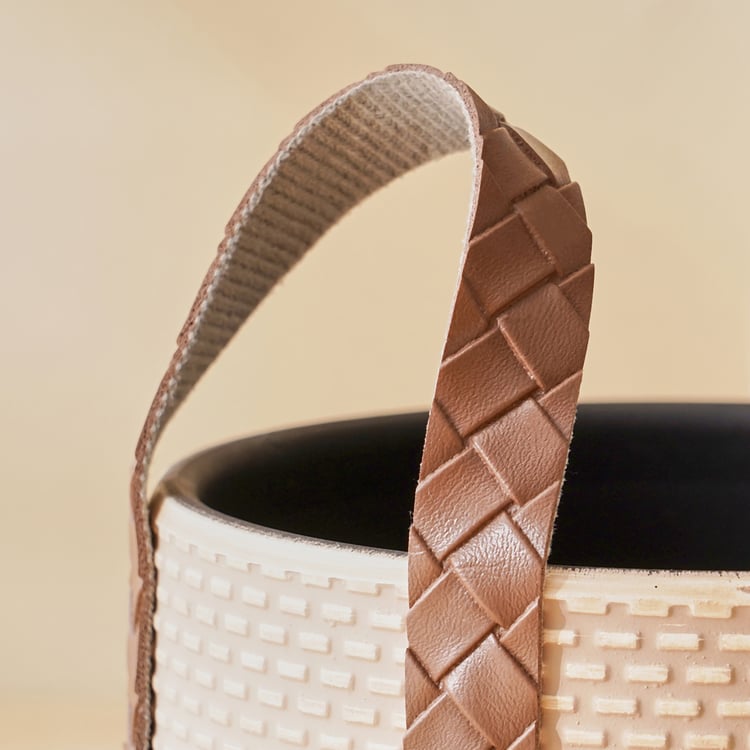 This planter combines style and practicality with it's covered design. Made from terracotta, it features texture outerwear and side straps for easy handling. Perfect for indoor or outdoor spaces, it adds charm and convenience to your plant display.