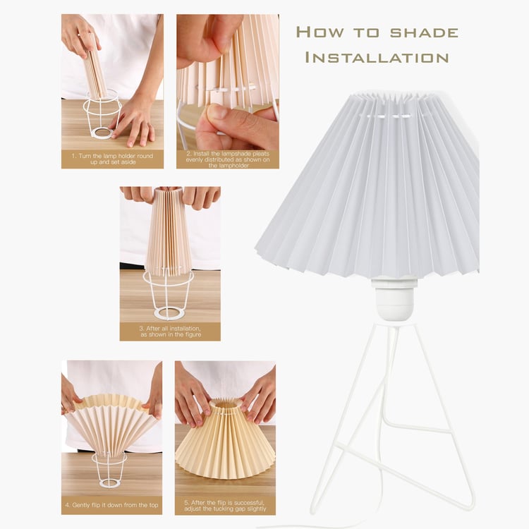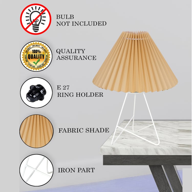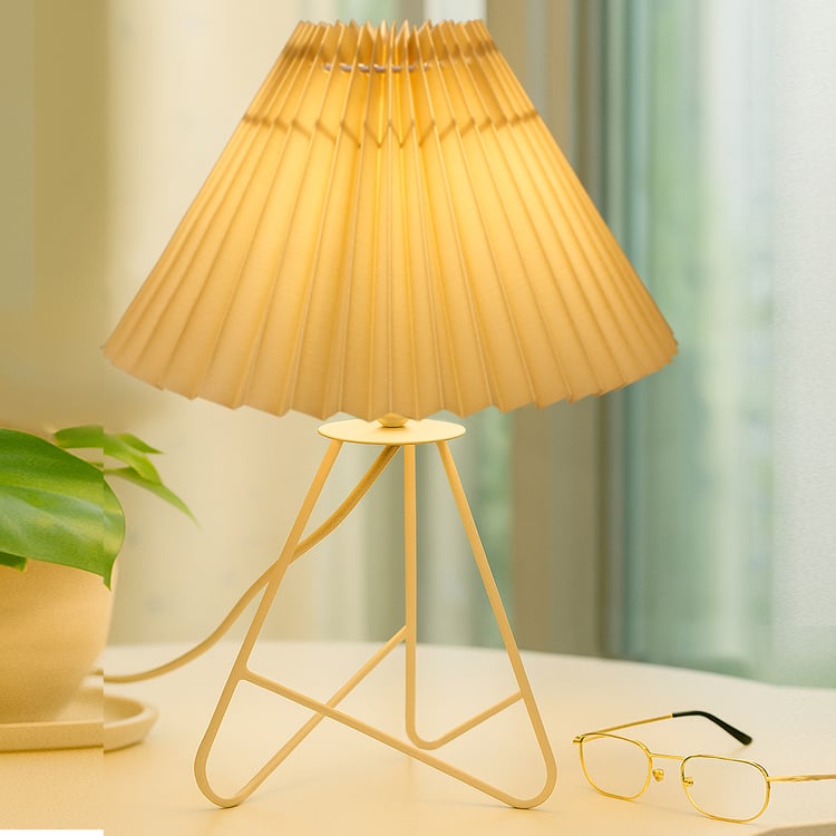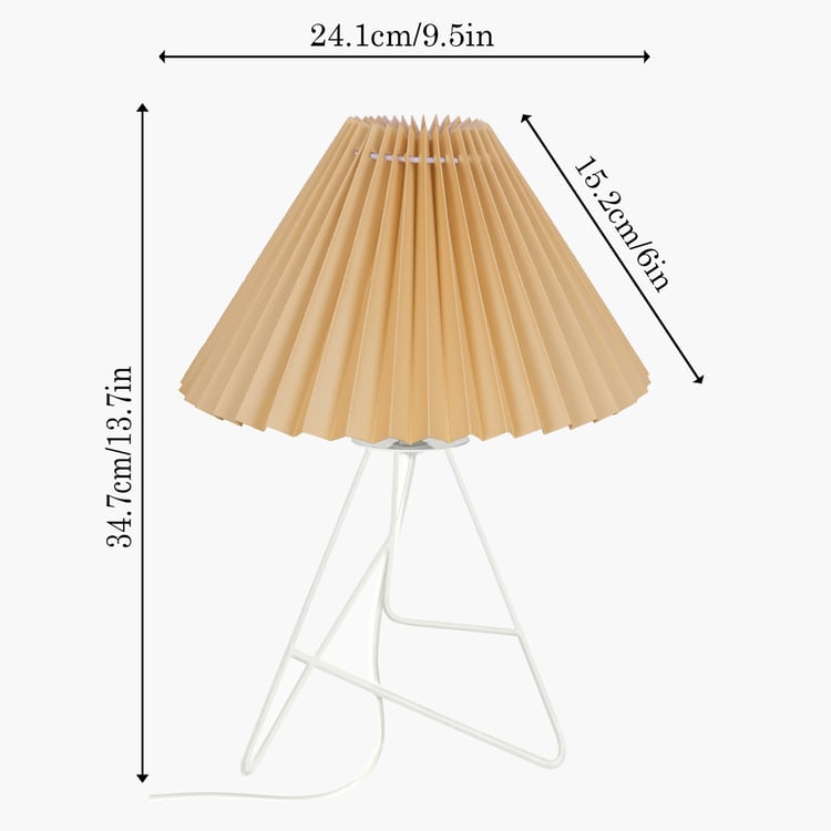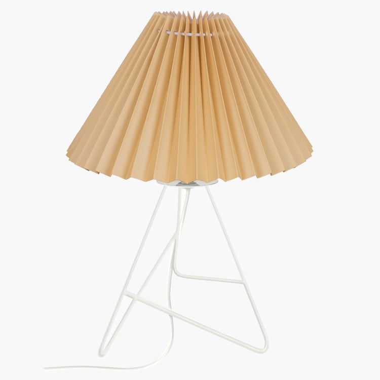 Add timeless charm to your home with this elegant table lamp, featuring a pleated fabric shade that casts a warm glow and a sturdy geometric tripod metal base. Handcrafted in India, it includes an E27 holder and a two-pin plug.
