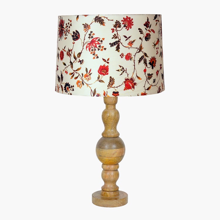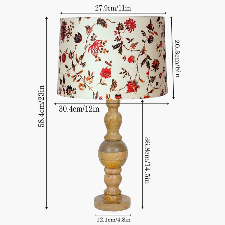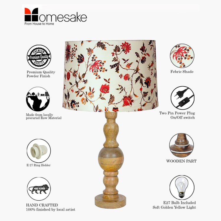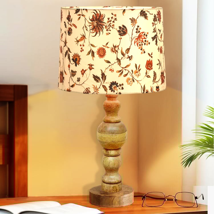 Crafted in a timeless classic style, this elegant table lamp brings a touch of natural beauty to any room. The sturdy wooden base, intricately detailed with a hand-carved design, is paired with a floral-print fabric shade that diffuses a warm, soothing glow. Perfect for your nightstand, side table, or beside the sofa and bed, it blends charm with functionality. Designed with an E27 bulb holder, it includes a warm bulb for instant use and a convenient two-pin plug with an on/off switch for easy operation.