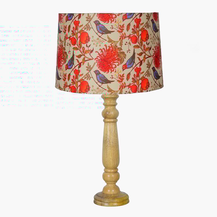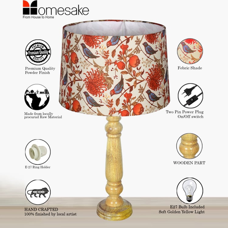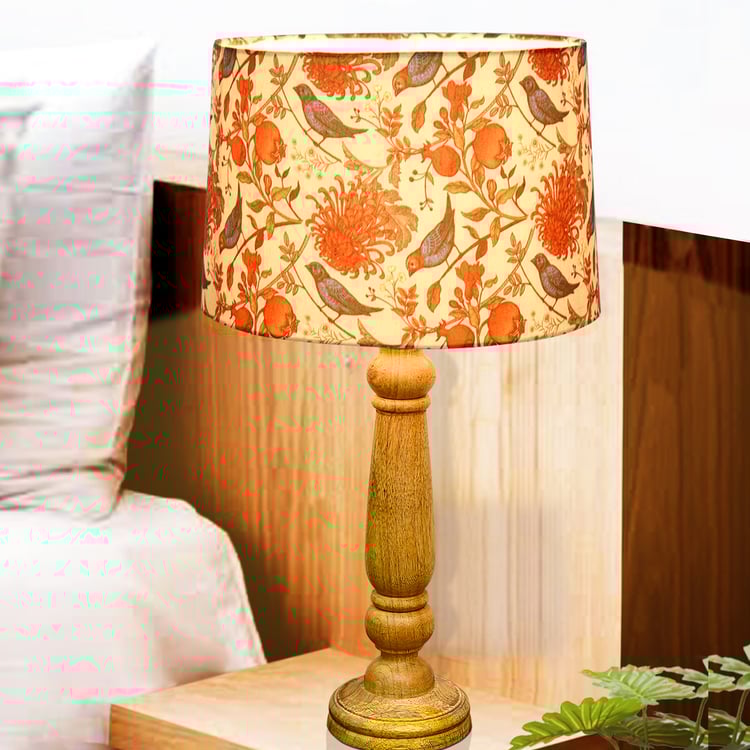 Crafted in a timeless classic style, this elegant table lamp brings a touch of natural beauty to any room. The sturdy wooden base, intricately detailed with a hand-carved design, is paired with a printed fabric shade that diffuses a warm, soothing glow. Perfect for your nightstand, side table, or beside the sofa and bed, it blends charm with functionality. Designed with an E27 bulb holder, it includes a warm bulb for instant use and a convenient two-pin plug with an on/off switch for easy operation.