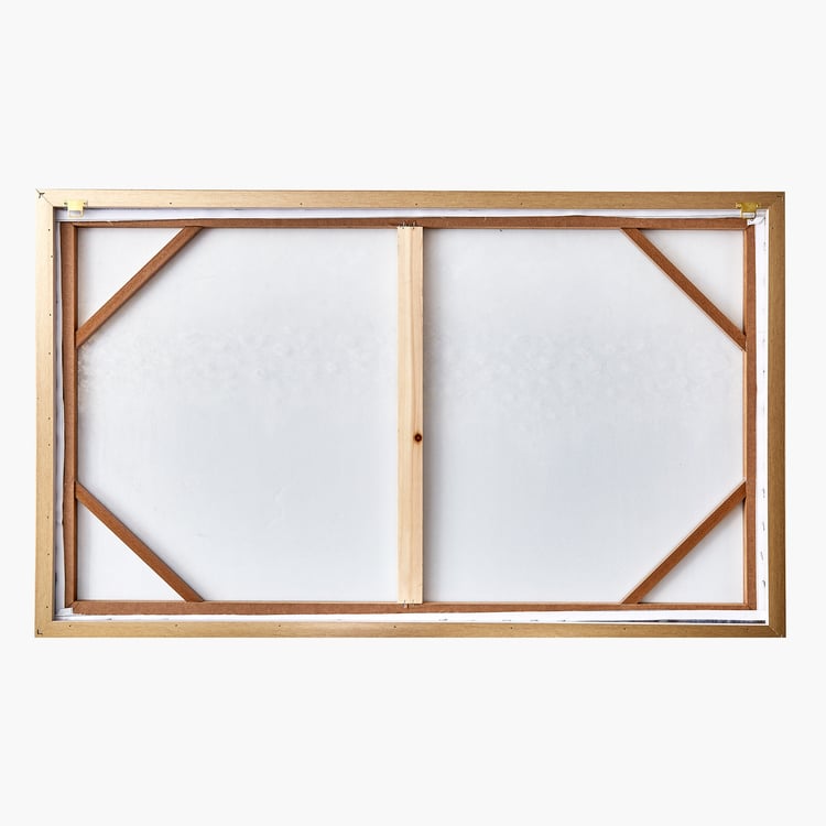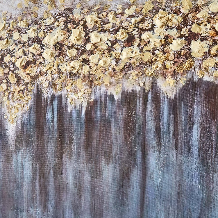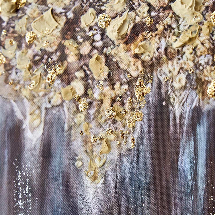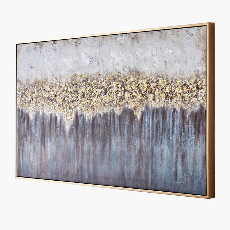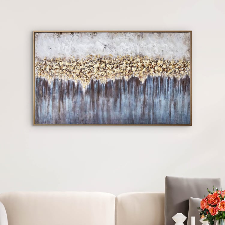 Enhance your decor with this canvas picture frame. Its sturdy MDF borders showcase a hand-painted seashore design with subtle variations and shimmering gold accents that evoke flowing water, adding sophistication and visual interest.