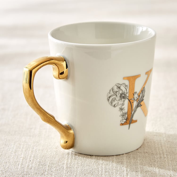 Add a personal touch to your coffee routine with this coffee mug. Crafted from high-quality bone china, it offers a delicate, refined look while being exceptionally strong, lightweight, and chip-resistant. The finely embossed letter “K” adds charm, while the radiant gold-finished handle lends an elegant touch. With a generous 350 ml capacity, it’s perfect for coffee, tea, or any hot beverage.