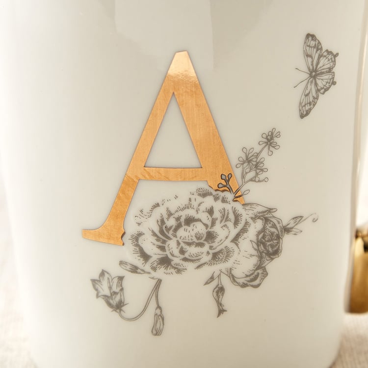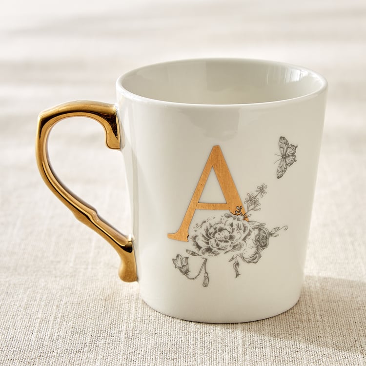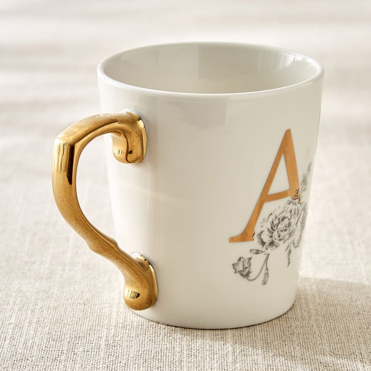 Start your mornings in style with your favourite brew in this printed coffee mug. Crafted from high-quality bone china, it offers a delicate, refined look while being exceptionally strong, lightweight, and chip-resistant. The finely printed letter “A” adds charm, while the radiant gold-finished handle lends an elegant touch.