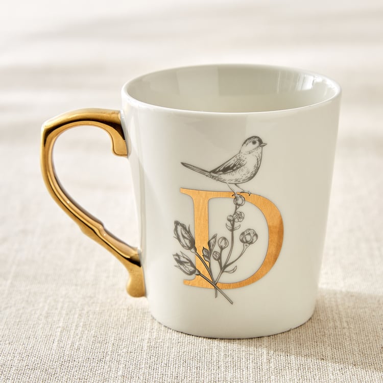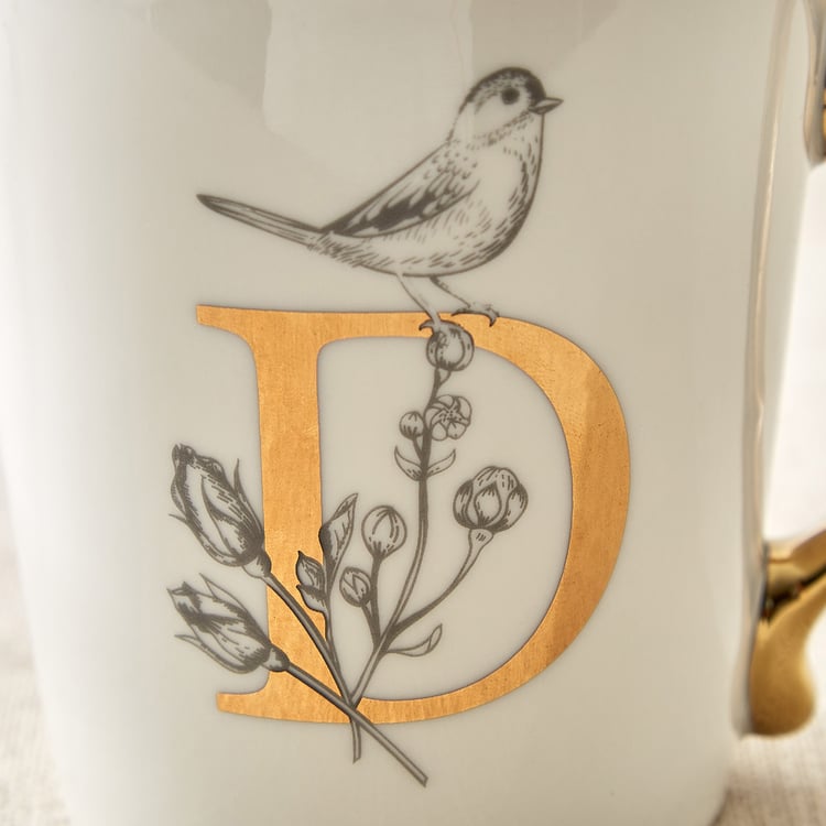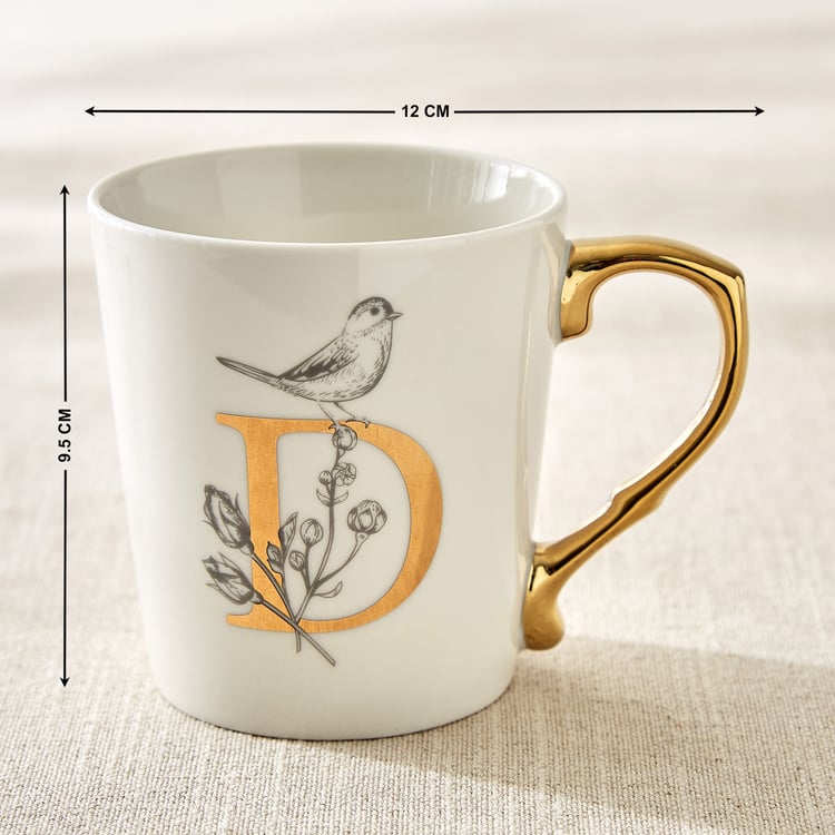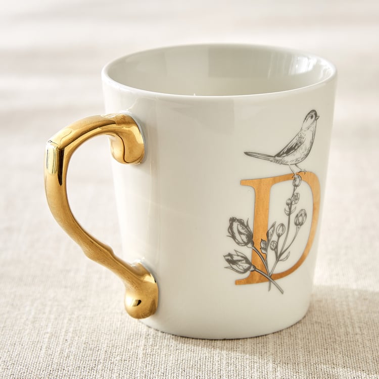 Start your mornings in style with your favourite brew in this printed coffee mug. Crafted from high-quality bone china, it offers a delicate, refined look while being exceptionally strong, lightweight, and chip-resistant. The finely printed letter “D” adds charm, while the radiant gold-finished handle lends an elegant touch.