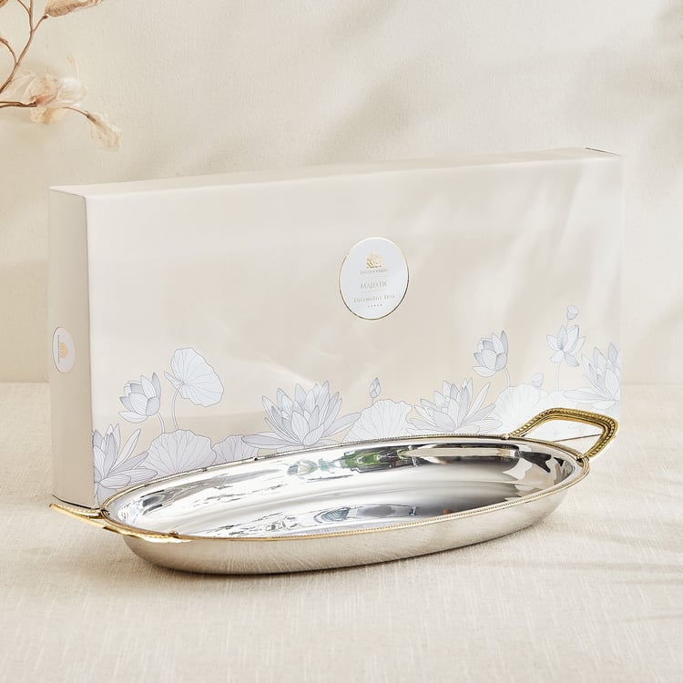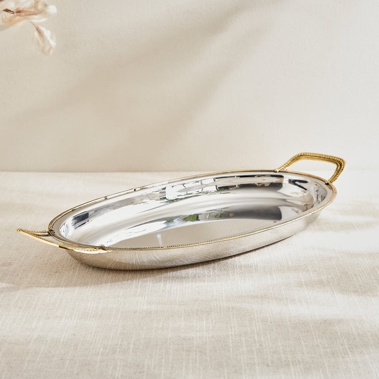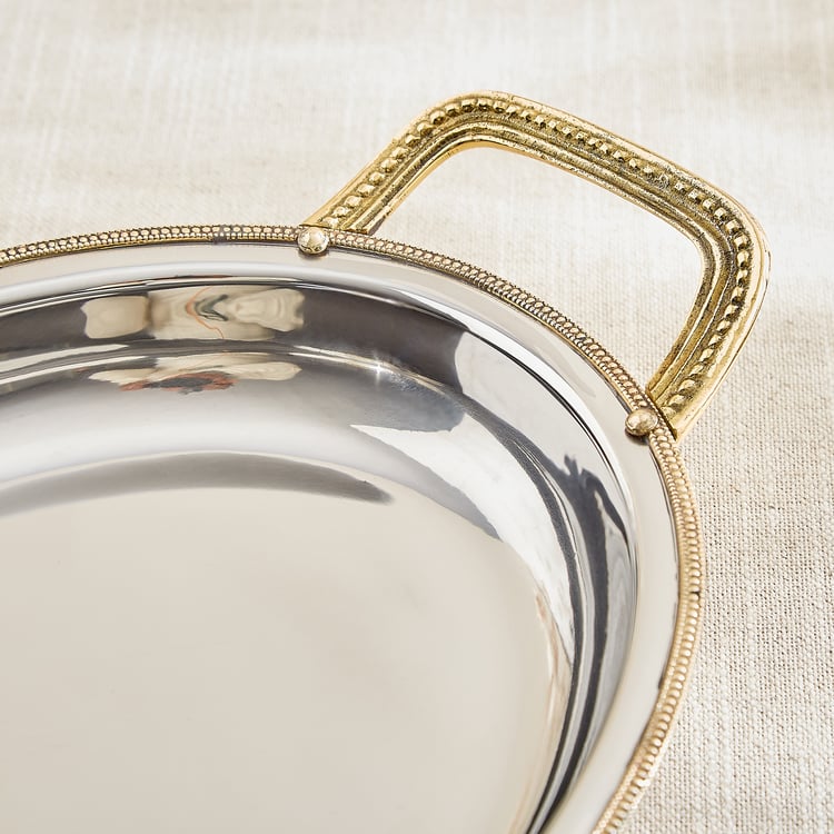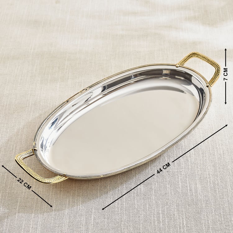 This elegant steel serving tray features sturdy brass handles that blend durability with timeless charm. Perfect for serving, it adds a refined, sophisticated touch to any table setting.