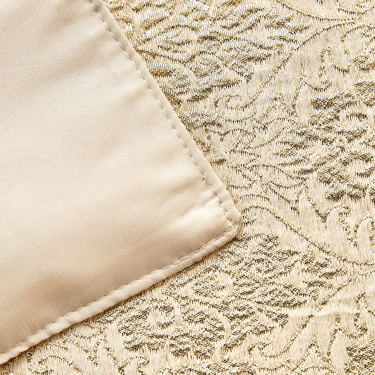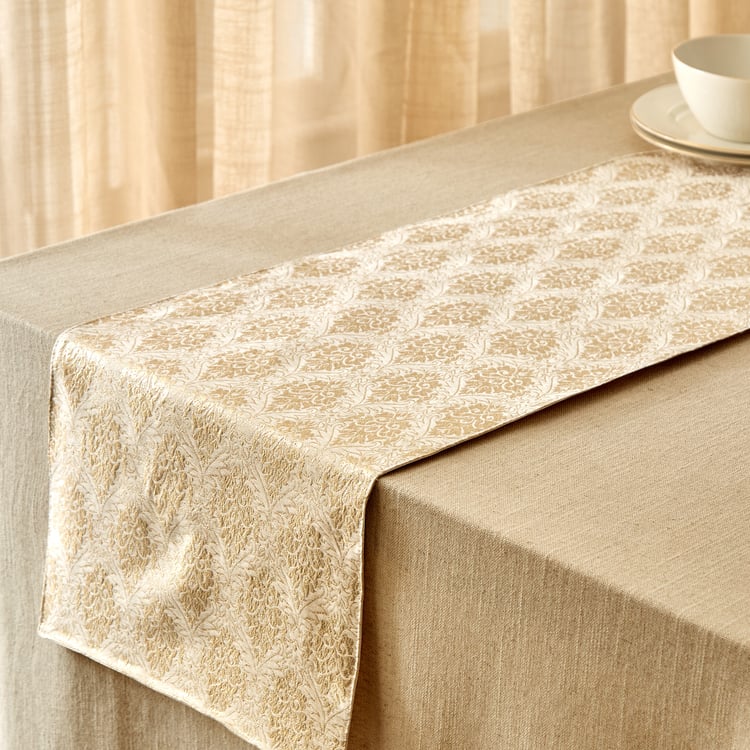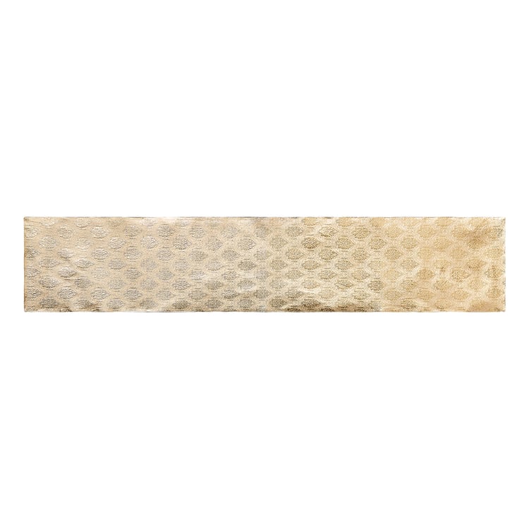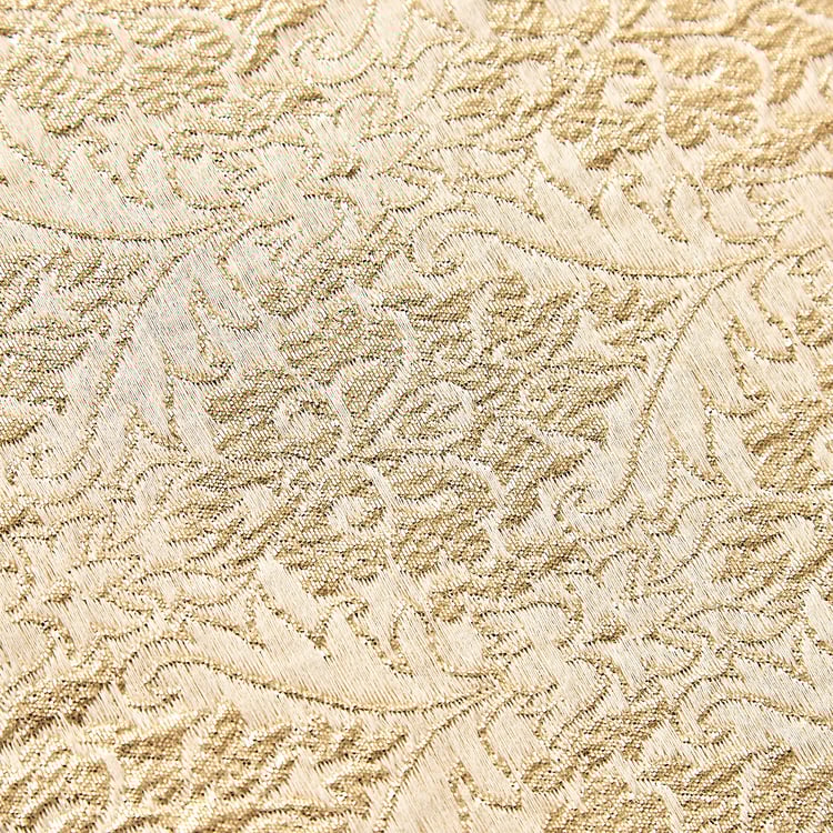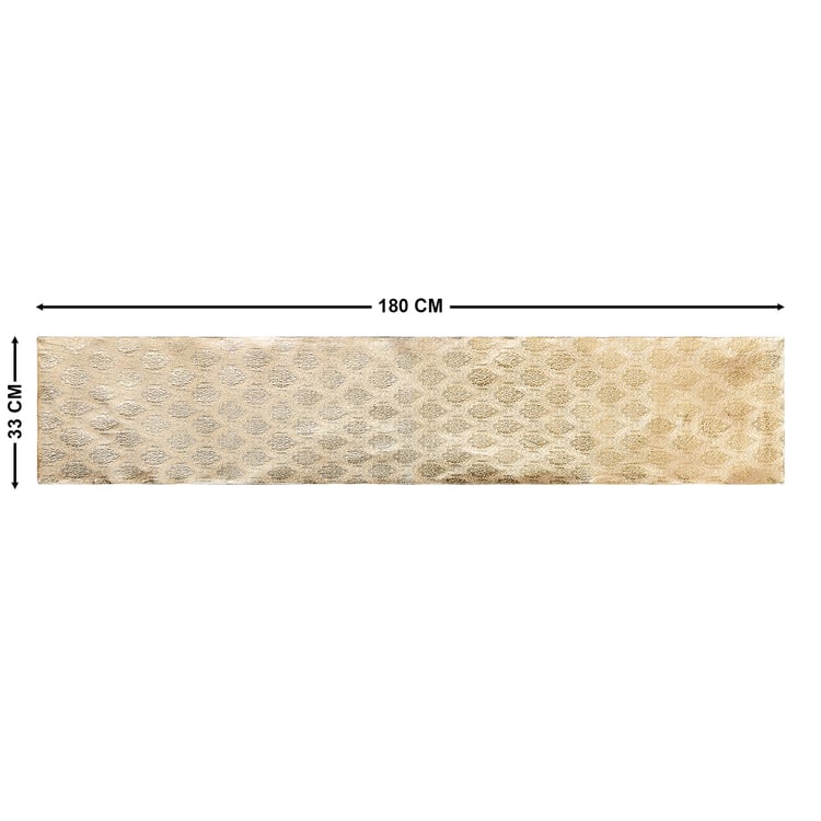 This jacquard polyester table runner features elegant zari texture, adding subtle shimmer to dining spaces while protecting surfaces with durable, easy-care construction and refined everyday style.