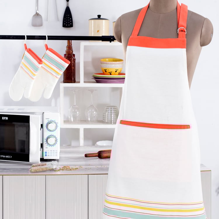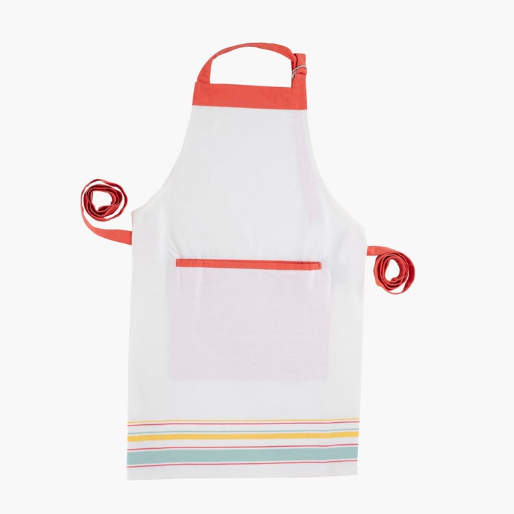 Cook in comfort and style with this kitchen apron, designed to bring both practicality and a polished look to your daily routine. Made from cotton fabric, it offers a soft, breathable feel with durability for regular use. Featuring contrast ties, a striped hem, and a functional pocket with contrast trim, this apron keeps essentials handy while adding a neat, coordinated touch to your cooking or baking time.
