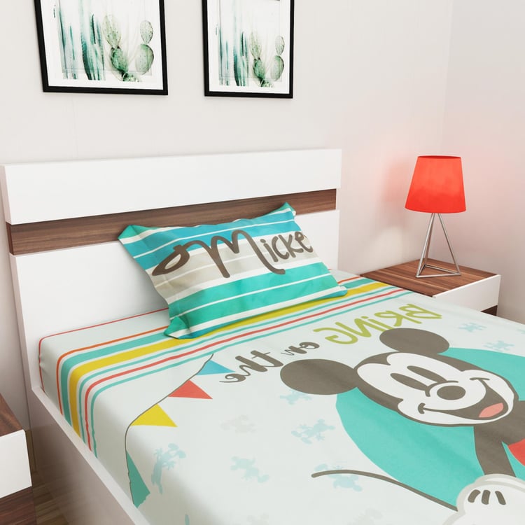 A vibrant single bed sheet set of two pieces, defined by your little one's favourite Mickey and Minnie print on the surface to impart a fresh appeal to your bedroom d‚cor. Crafted from soft cotton, it includes a single bed sheet with a pillow cover, featuring similar prints, to create an eclectic mix of comfort and style for your child's bedroom.