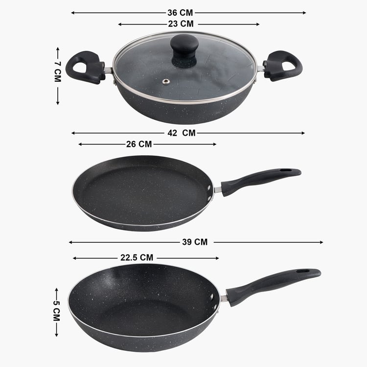 Kadhai : 36 cm x 23 cm x 7 cm, Tawa : 42 cm x 26 cm, Frying Pan : 39 cm x 22.5 cm x 5 cm