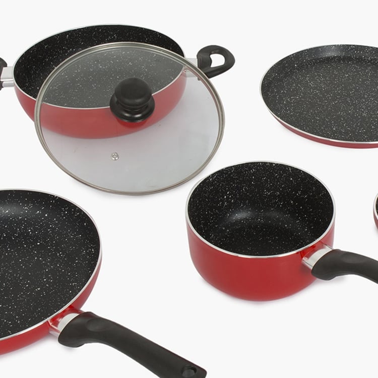 1 Kadai With 1 Lid, 1 Fry Pan, 1 Dosa Tawa, 1 Roti Tawa, 1 Milk Pan, 1 Tadka Pan, 3 Nylon Spatulas