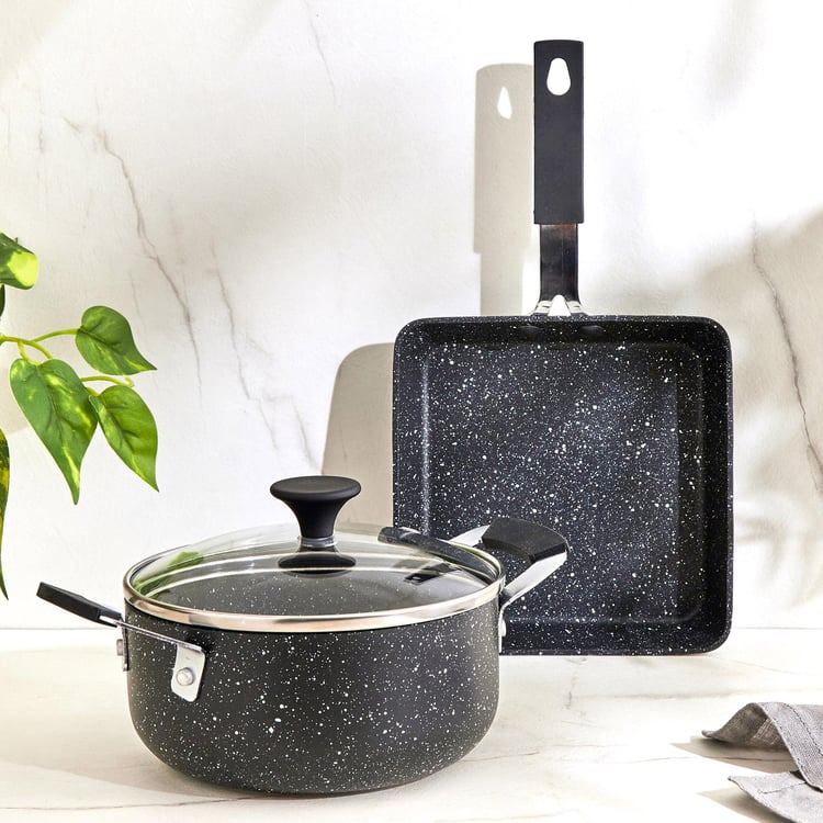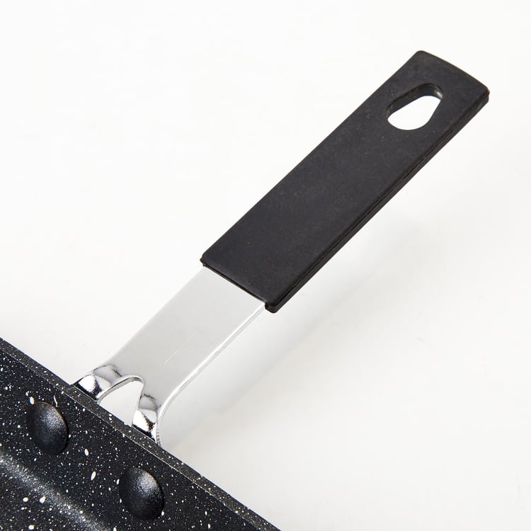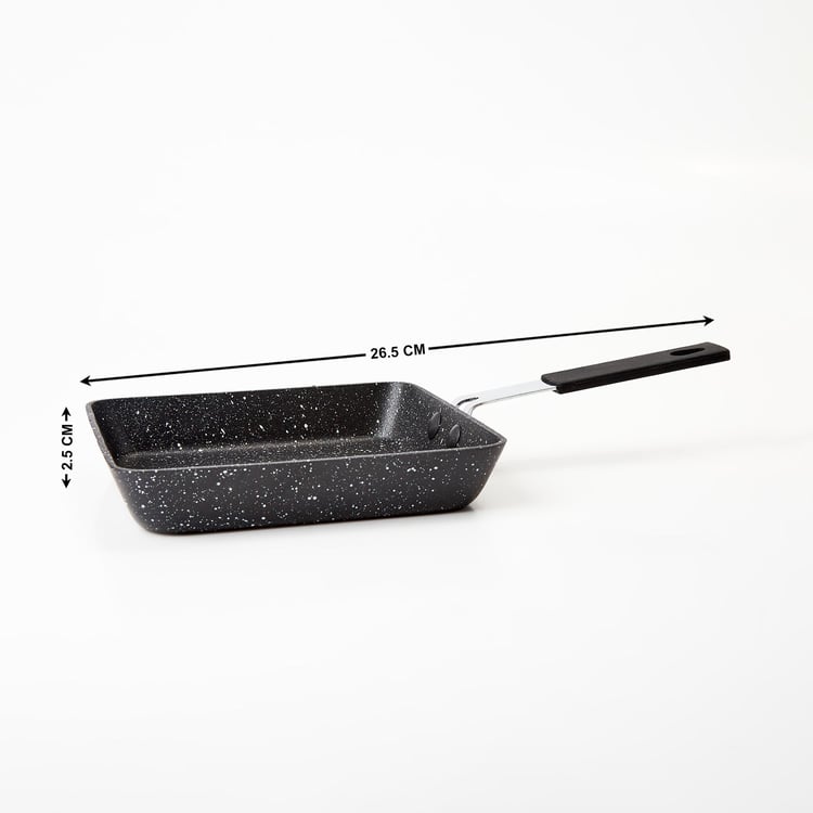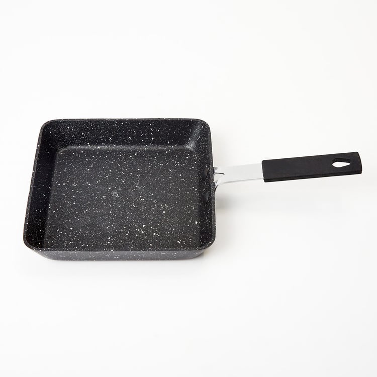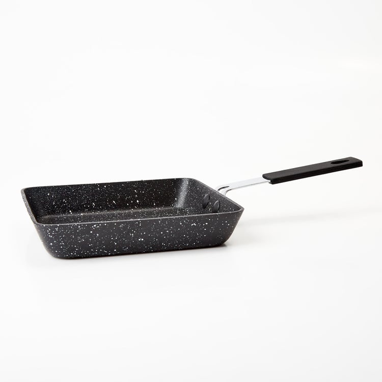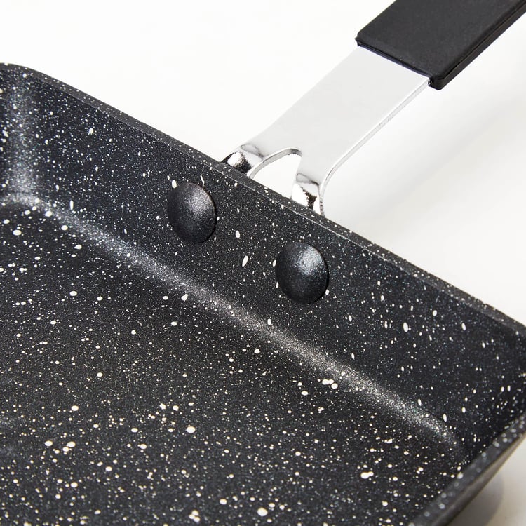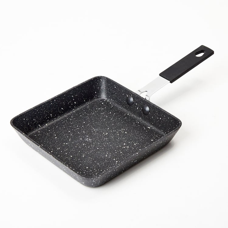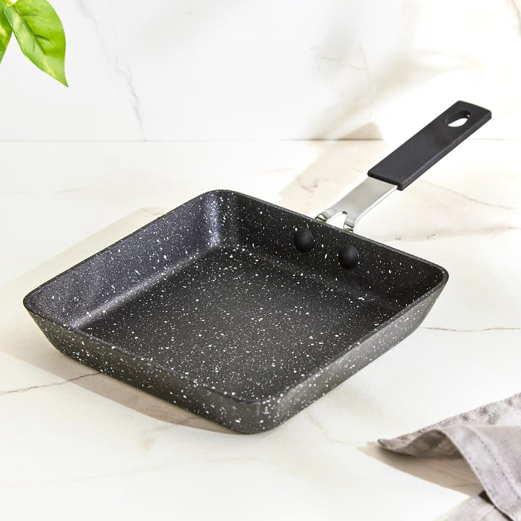 This mini frying pan from Home Centre is made with aluminium, which is food-grade, corrosion-resistant, and has the same wall thickness. It thus ensures even heat distribution, which in turn ensures the food does not burn. This cookware features a 3-layer non-stick marble coating that increases the smoothness of the inner surface manifolds. This smooth coating allows cooking with minimal use of oil, so your food doesn't stick to the cookware. The marble finish makes the coating more durable and scratch-resistant. The firm grip handle and the defined edges are for easy flipping. Ideal for seasoning, frying, and more.