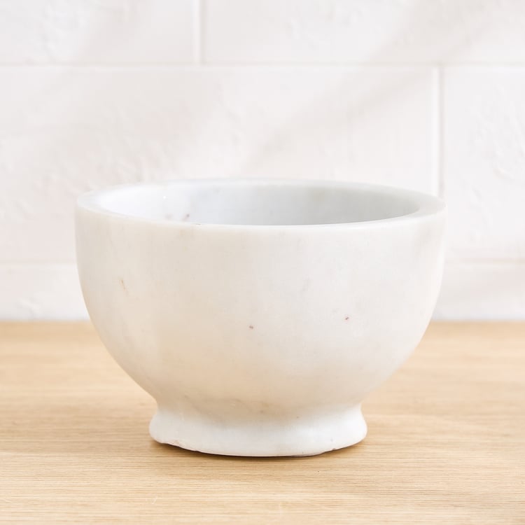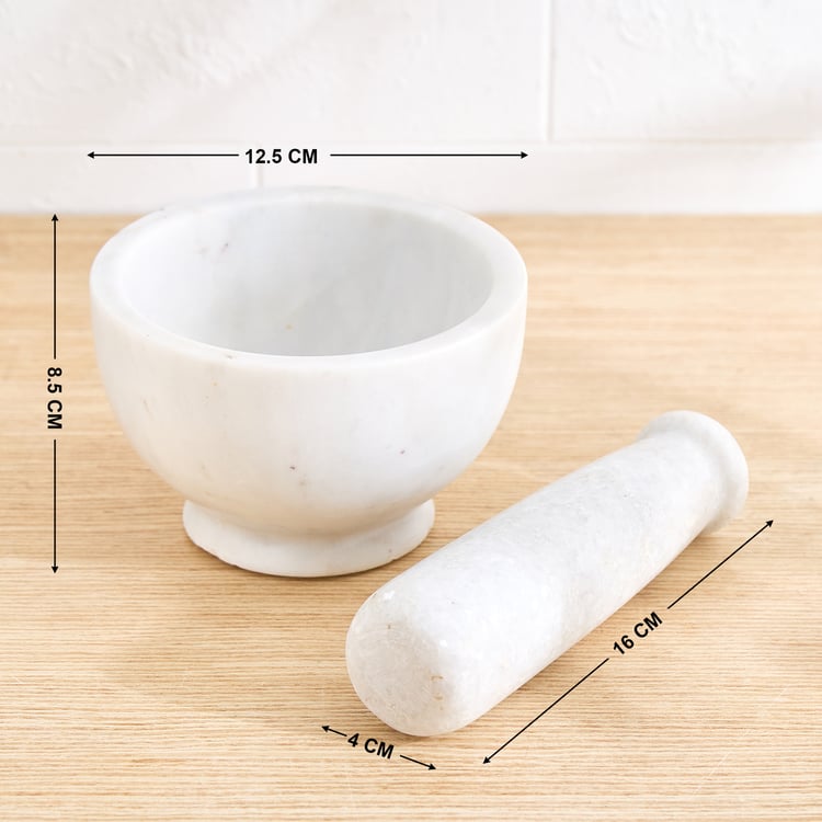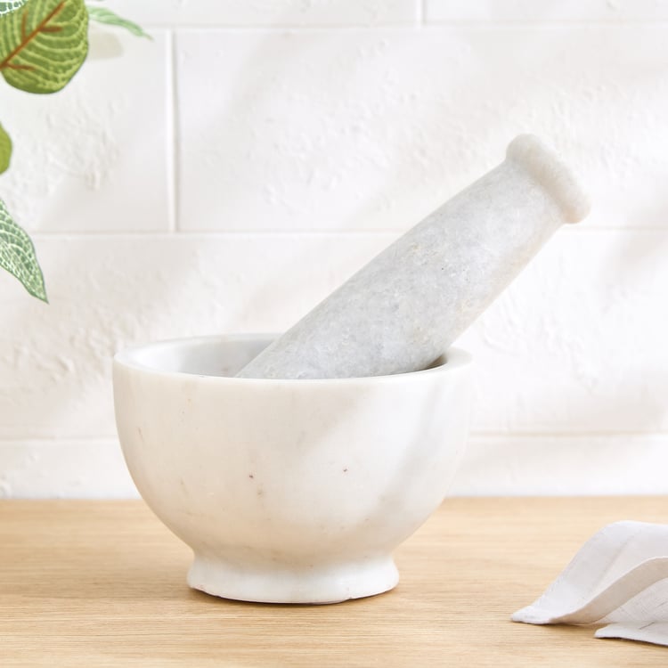 Grind and crush ingredients effortlessly with this mortar and pestle. Crafted from high-quality, non-porous marble, it ensures durability and prevents flavour absorption. Its heavy build offers stability, while the ergonomic pestle provides a comfortable grip, making it ideal for spices, herbs and fresh pastes.