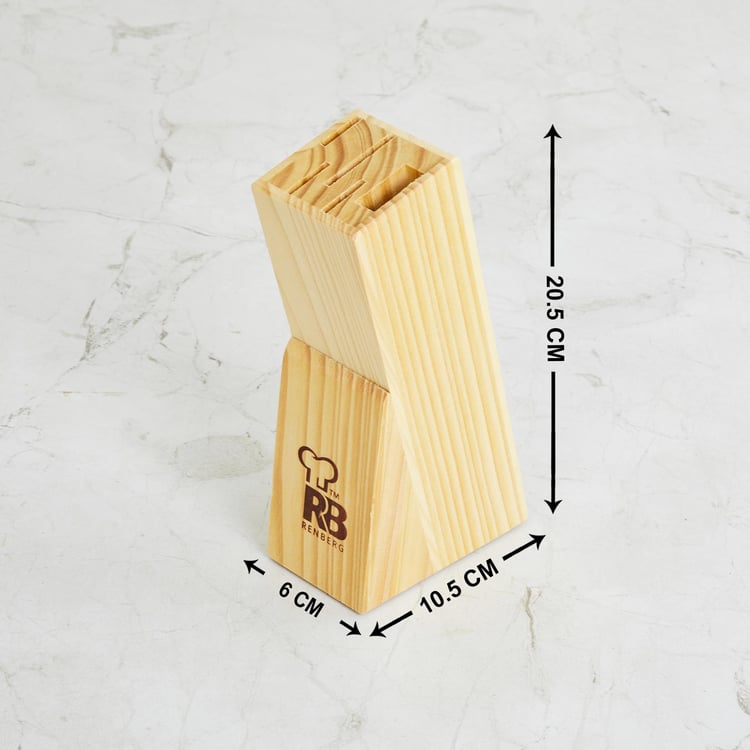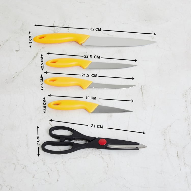 Wooden Block : 20.5 cm x 10.5 cm x 6 cm , Chef Knife: 32 cm x 3 cm , Paring Knife : 22.5 cm x 2.5 cm , Tomato Knife : 21.5 cm x 2.5 cm , Utility Knife : 19 cm x 2.5 cm , Scissors : 21 cm x 7 cm