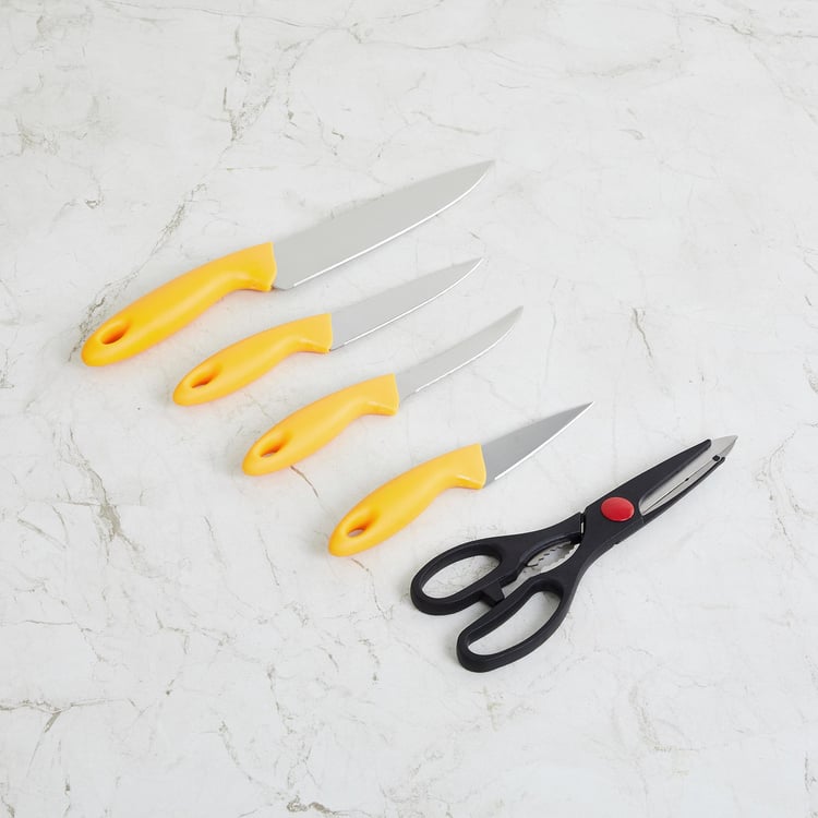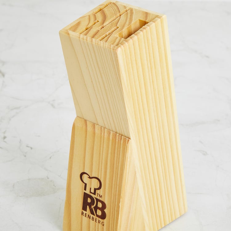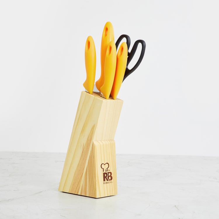 1 Chef Knife, 1 Tomato Knife, 1 Utility Knife,1 Paring Knife, 1 Scissor, 1 Wooden Block