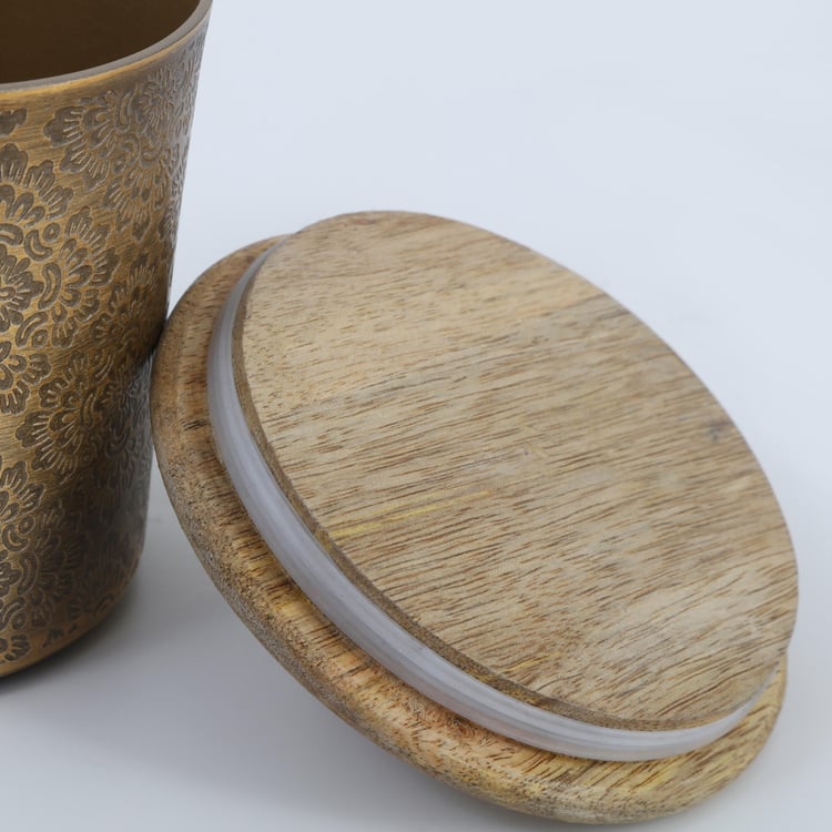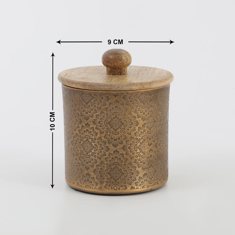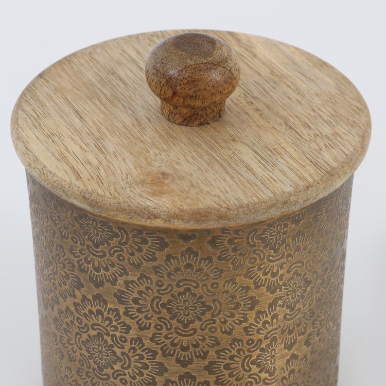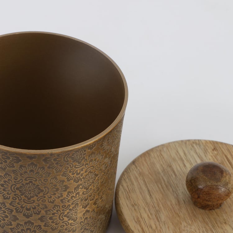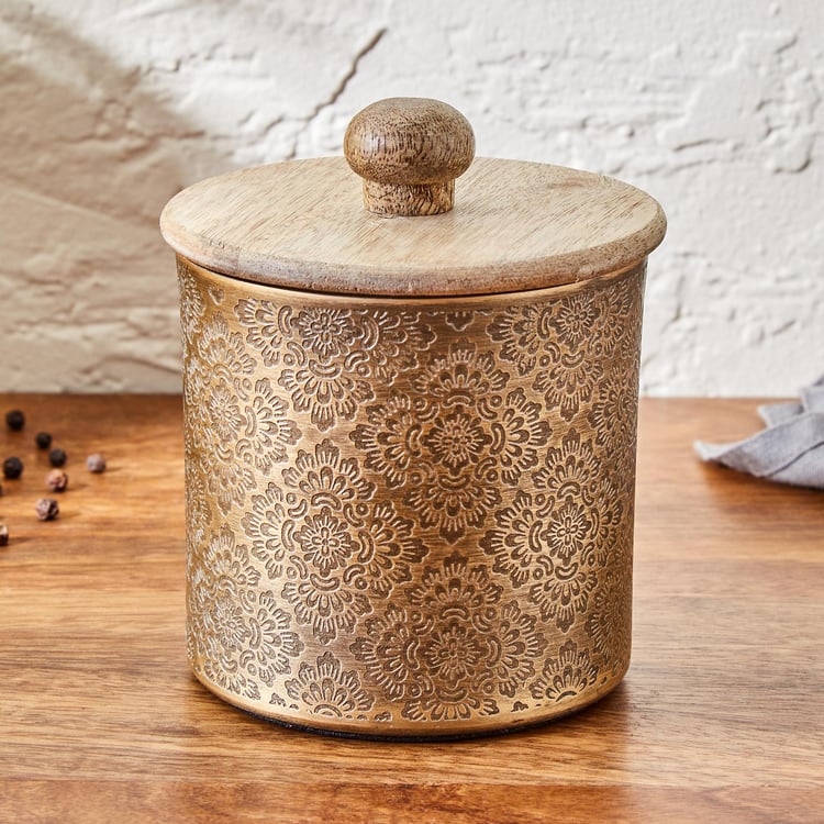 Store edibles safely with this canister with a lid. It comes with a textured surface, and cylindrical design, and is made from a durable material like aluminum.