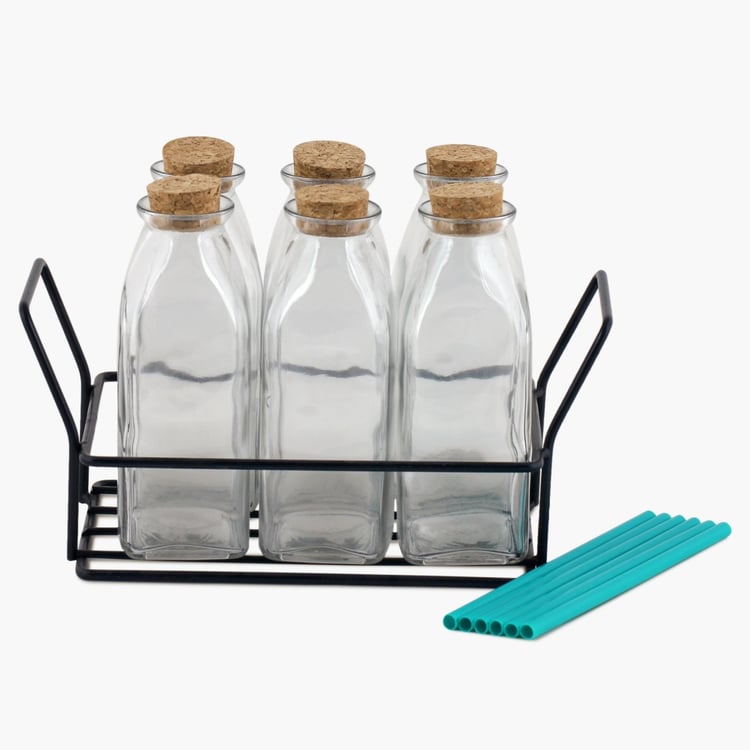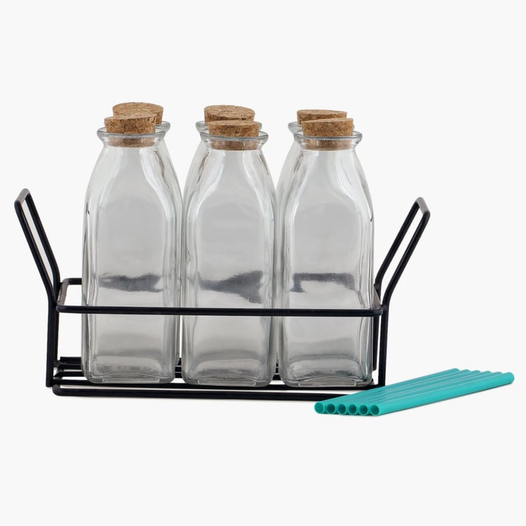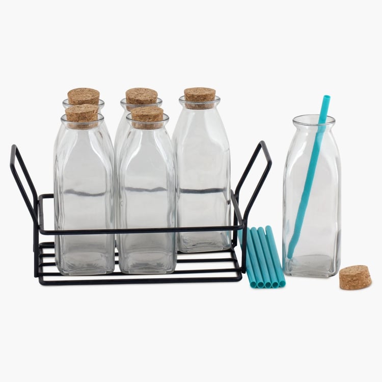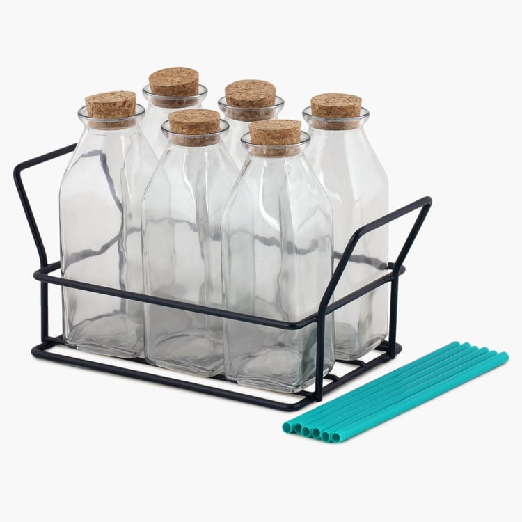 Add a pinch of fun and frolic to your kitchen with the Home Centre Glass Bottle Set! From classic cocktails to homemade lemonade, these attractive glass bottles along with the sturdy caddy are ideal for serving your guests some fun.